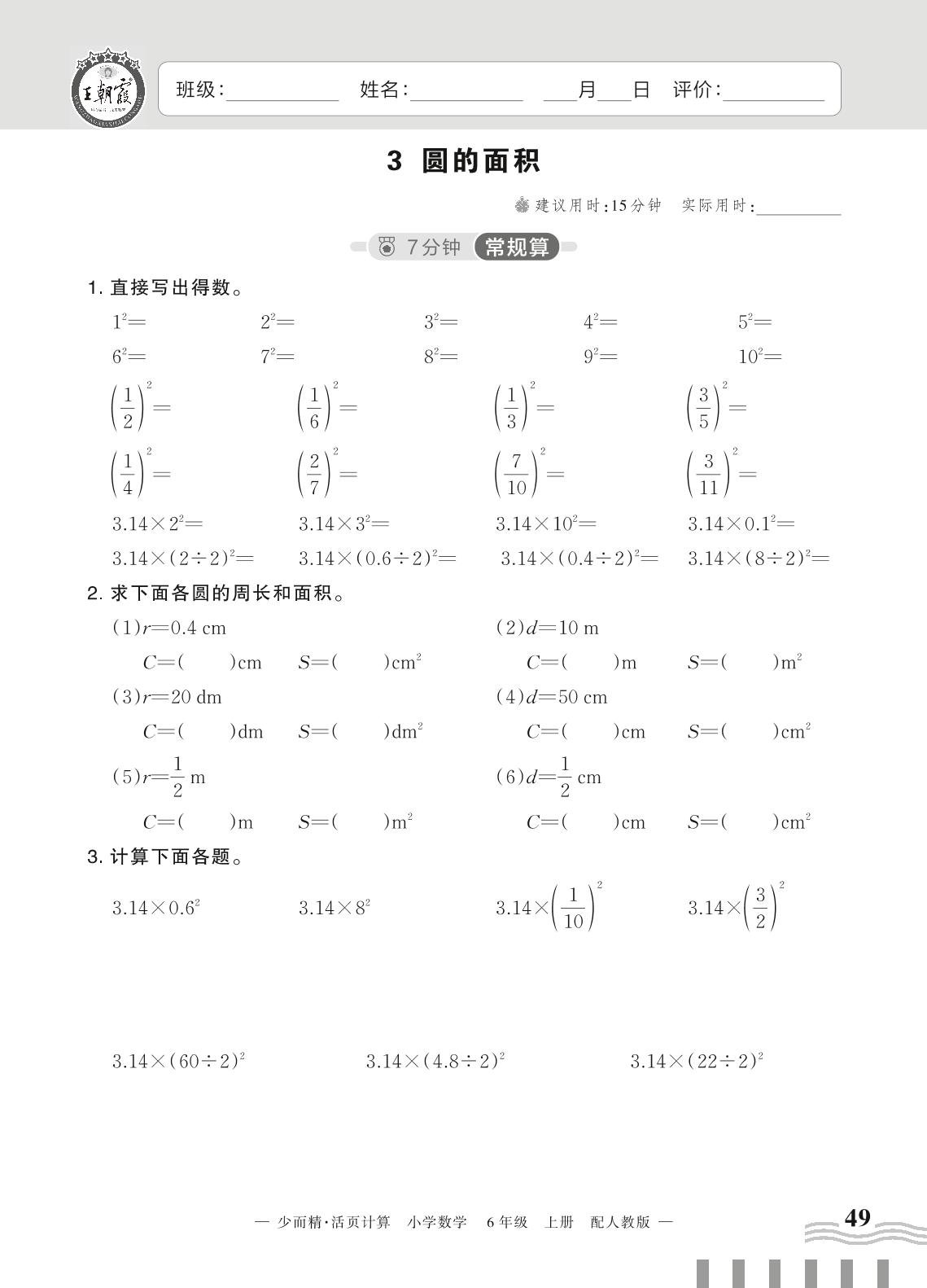 2023上册六年级数学人教版 五 圆——3 圆的面积