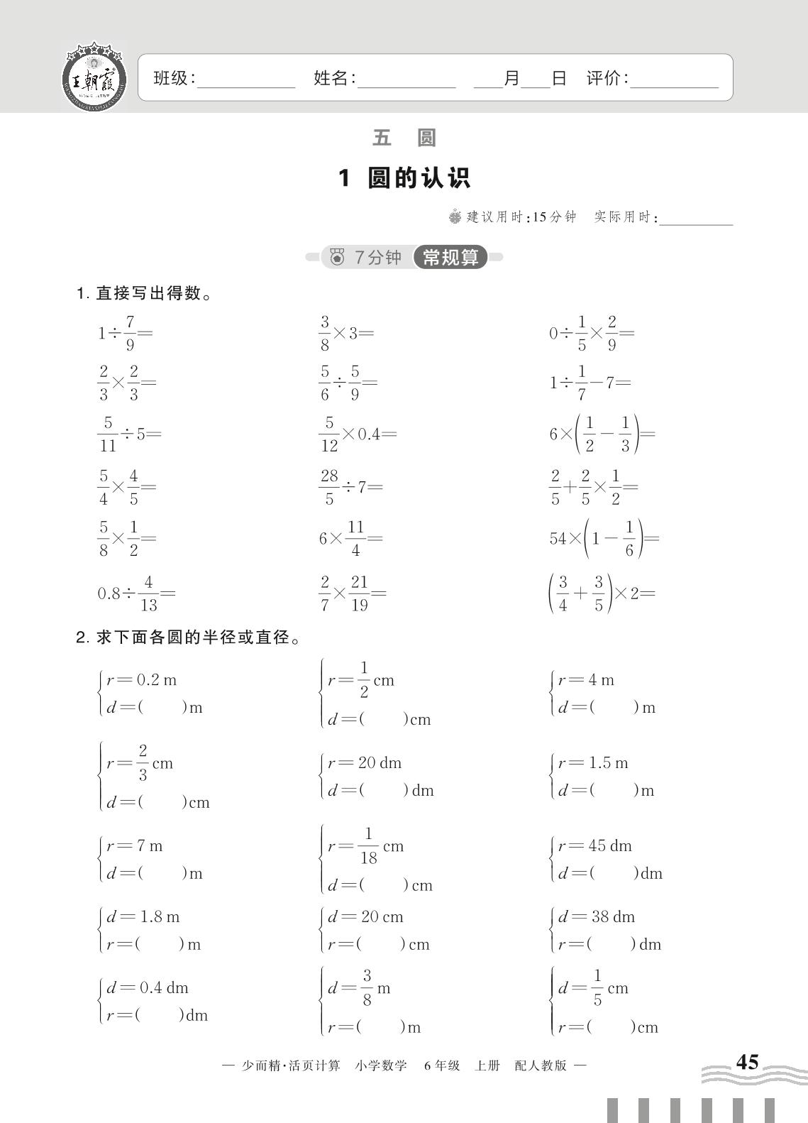 2023上册六年级数学人教版 五 圆——1 圆的认识