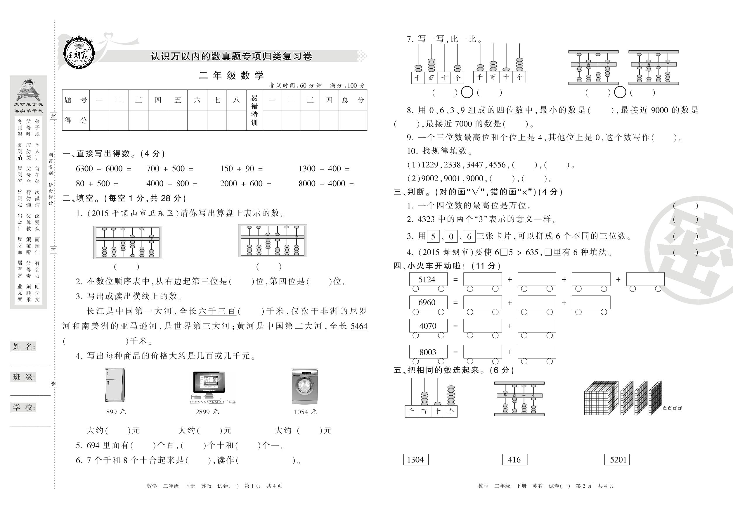 二年级数学苏教版下册专项卷