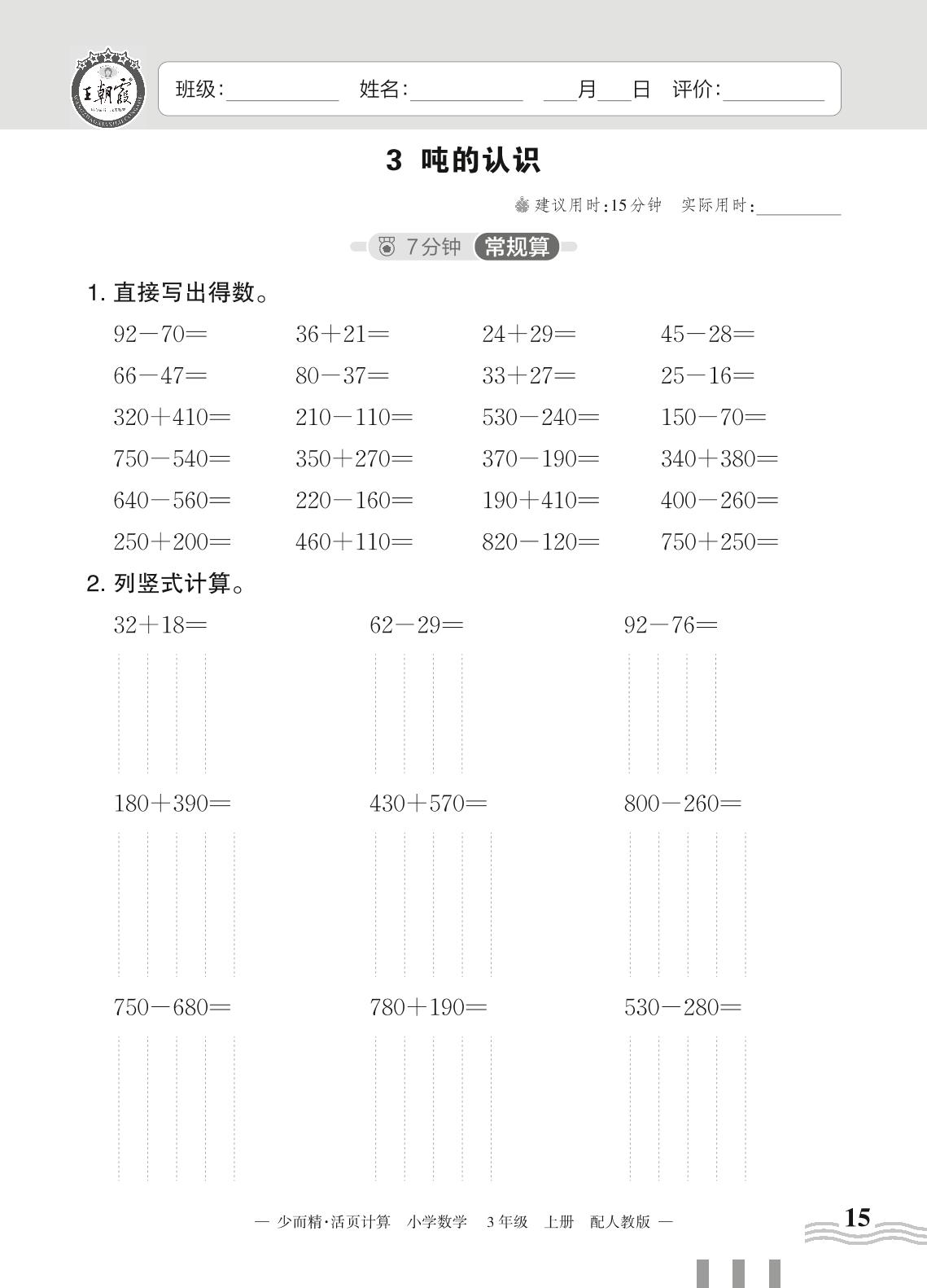 2023上册三年级数学人教版 三 测量——3 吨的认识