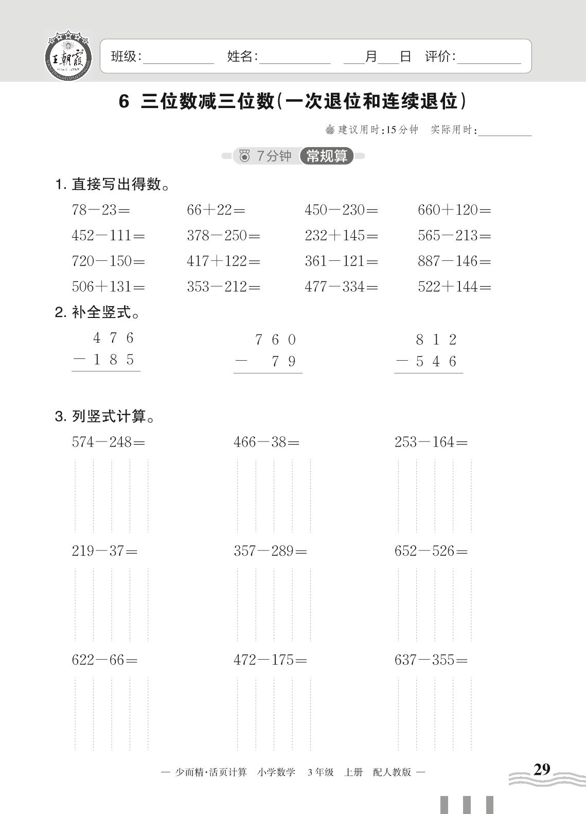 2023上册三年级数学人教版 四 万以内的加法和减法(二)——6 三位数减三位数(一次退位和连续退位)