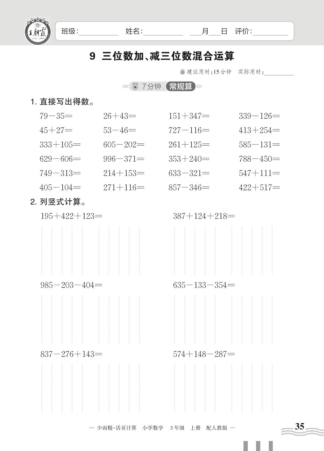2023上册三年级数学人教版 四 万以内的加法和减法(二)——9 三位数加、减三位数混合运算