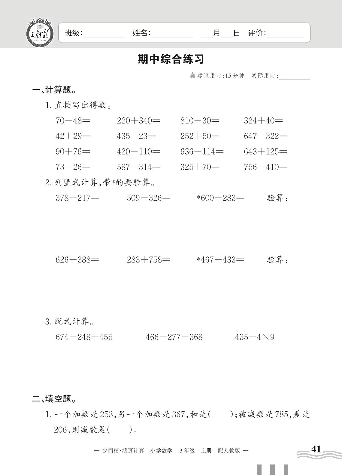 2023上册三年级数学人教版 期中综合练习(计算专练)