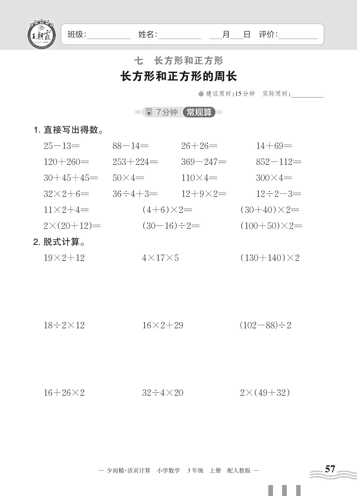 2023上册三年级数学人教版 七 长方形和正方形——长方形和正方形的周长