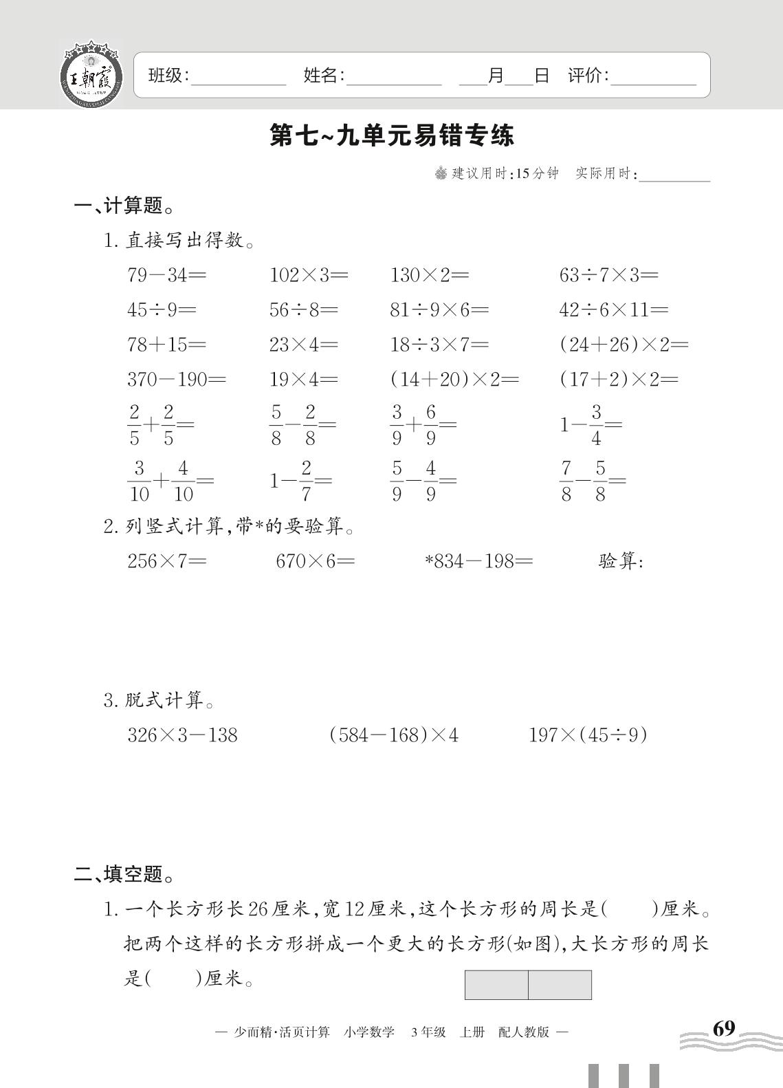 2023上册三年级数学人教版 第七~九单元易错专练