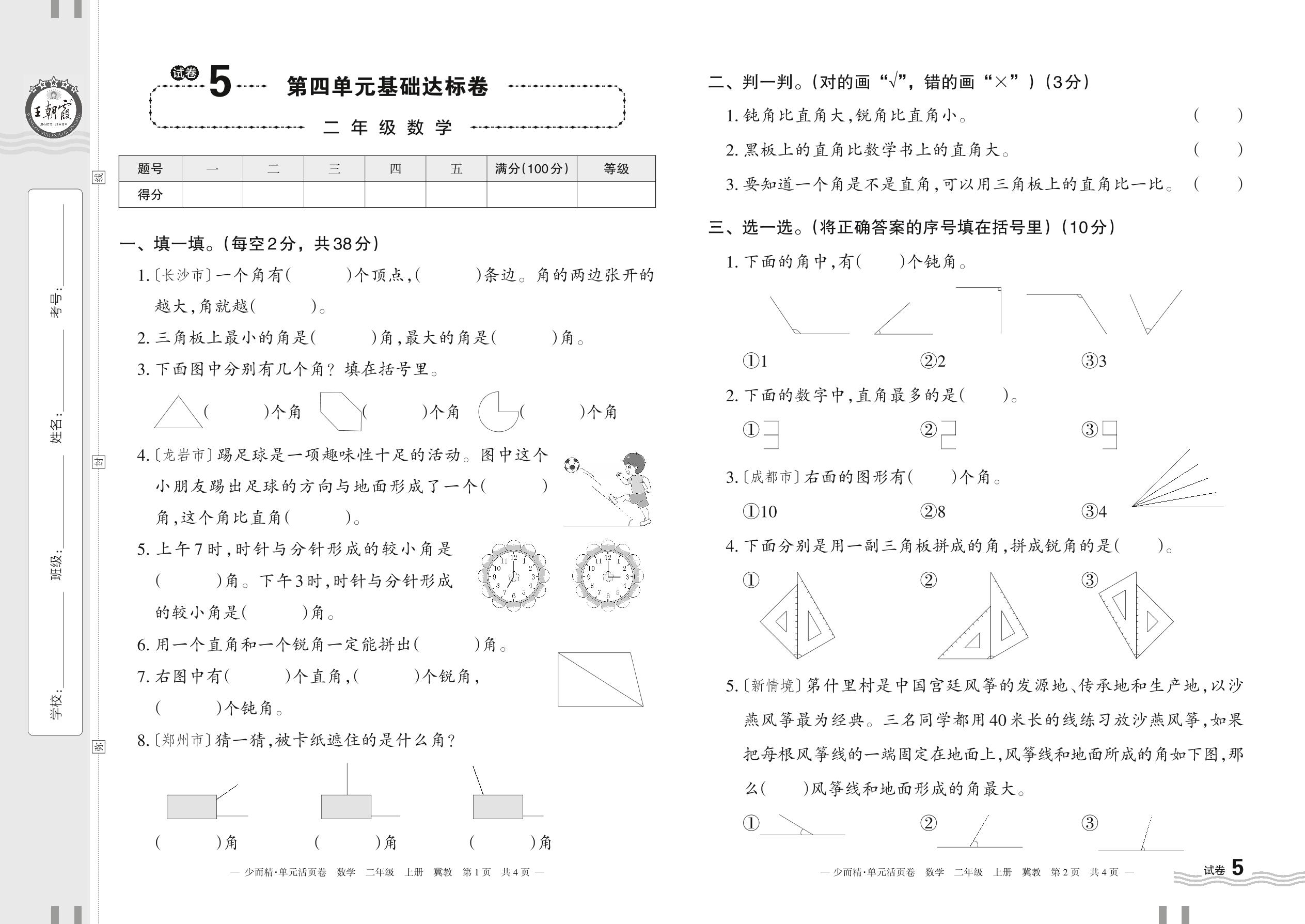 2023上册二年级数学冀教版 试卷5 第四单元基础达标卷