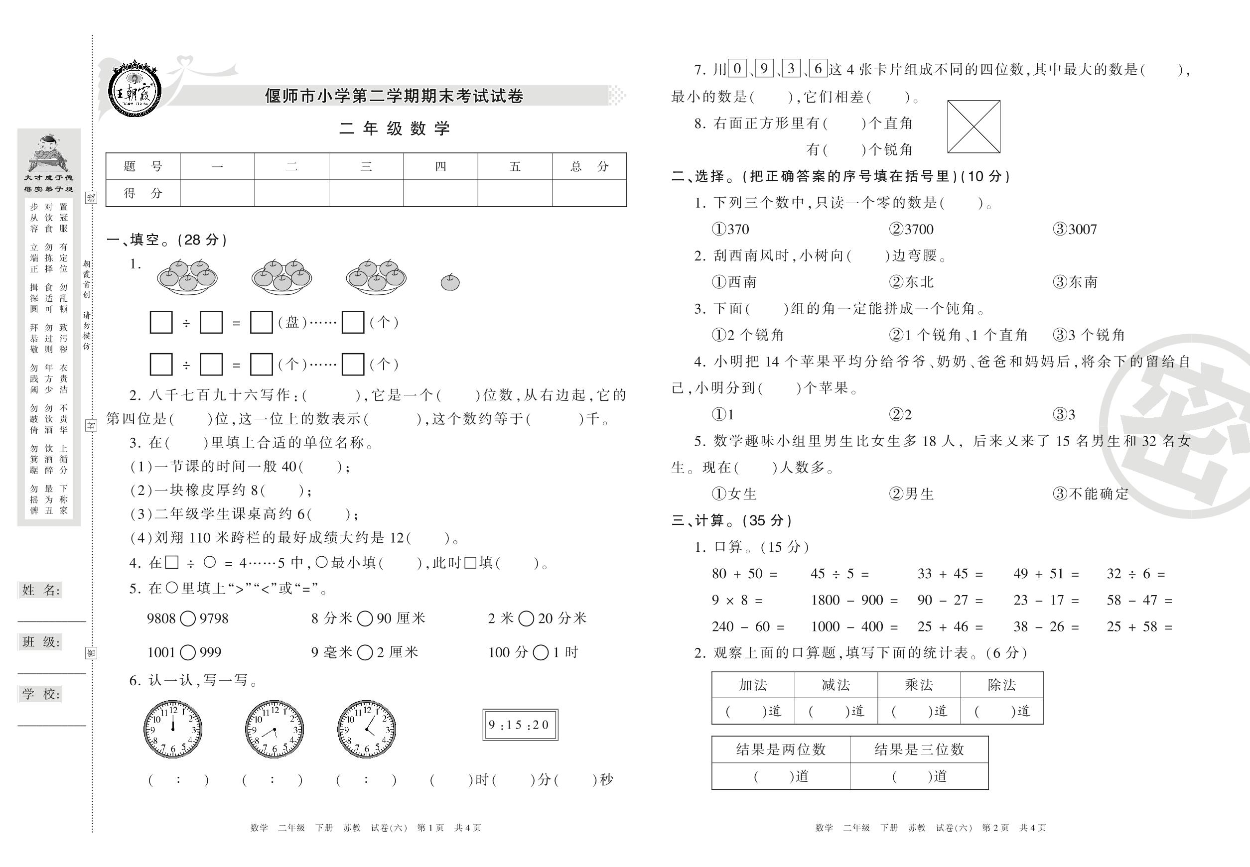 2015-2016学年第二学期偃师市二年级数学试卷(苏教版)【6】