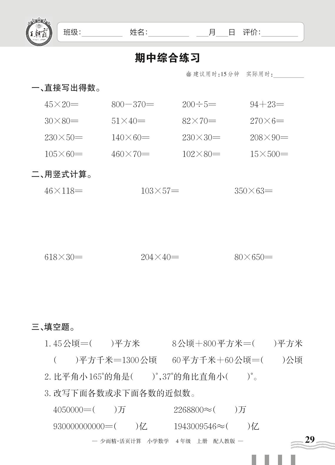 2023上册四年级数学人教版 期中综合练习(计算专练)