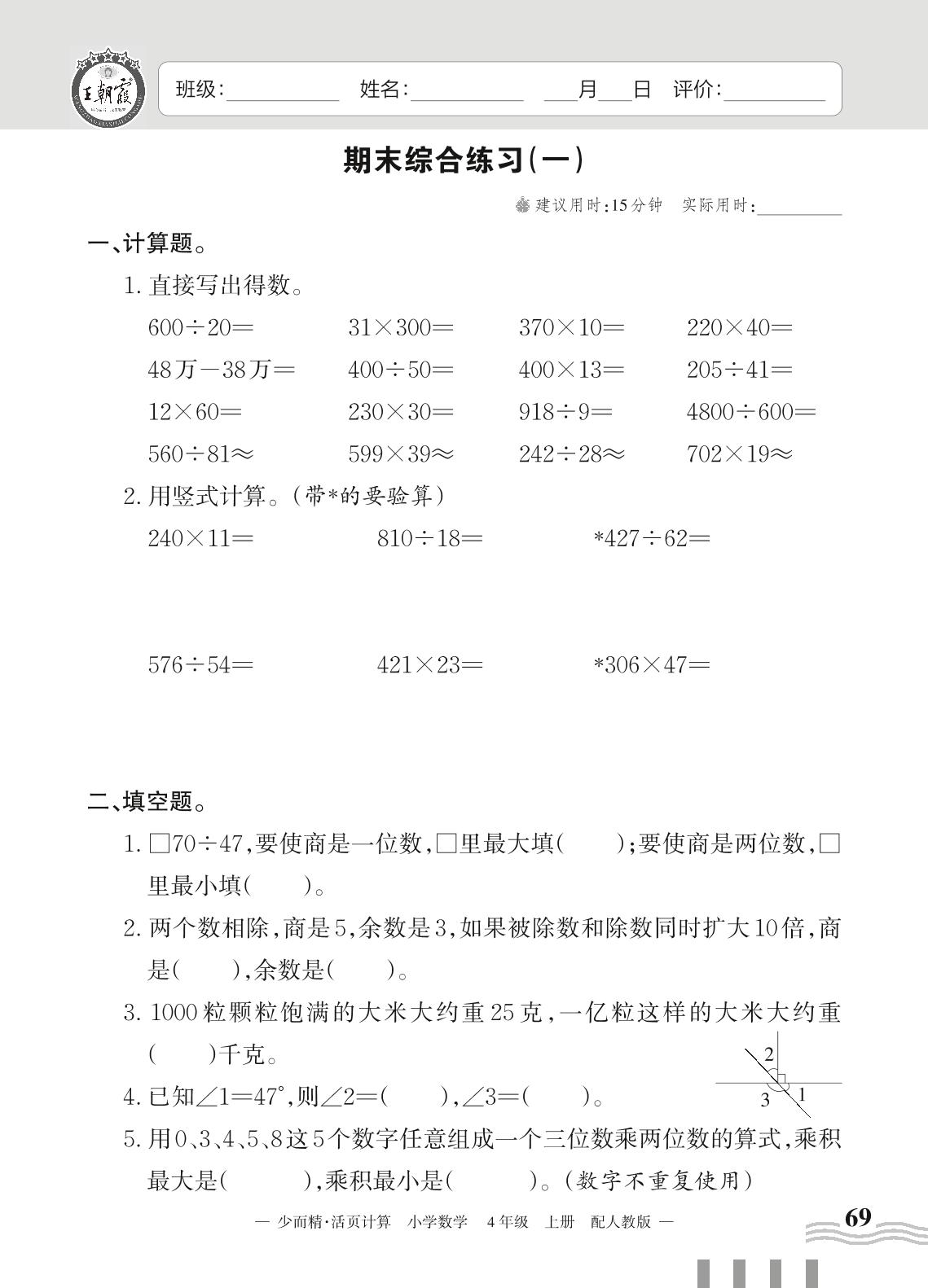 2023上册四年级数学人教版 期末综合练习(一)(计算专练)