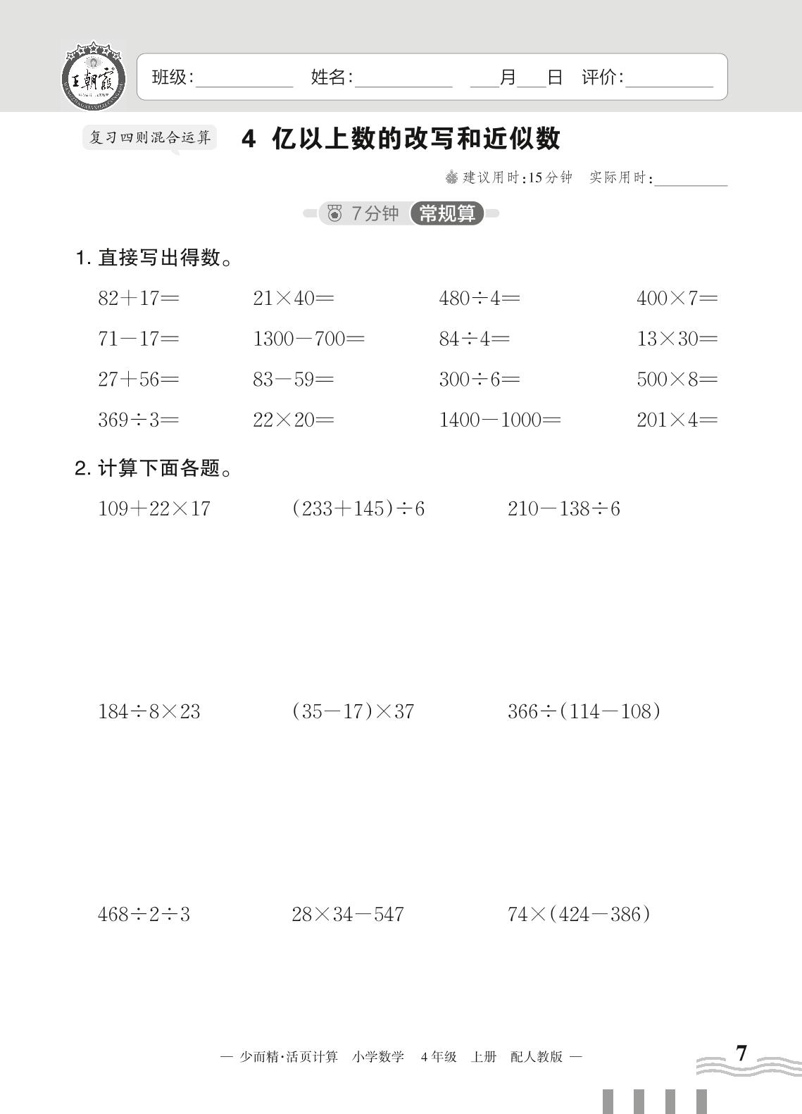 2023上册四年级数学人教版 一 大数的认识——4 亿以上数的改写和近似数