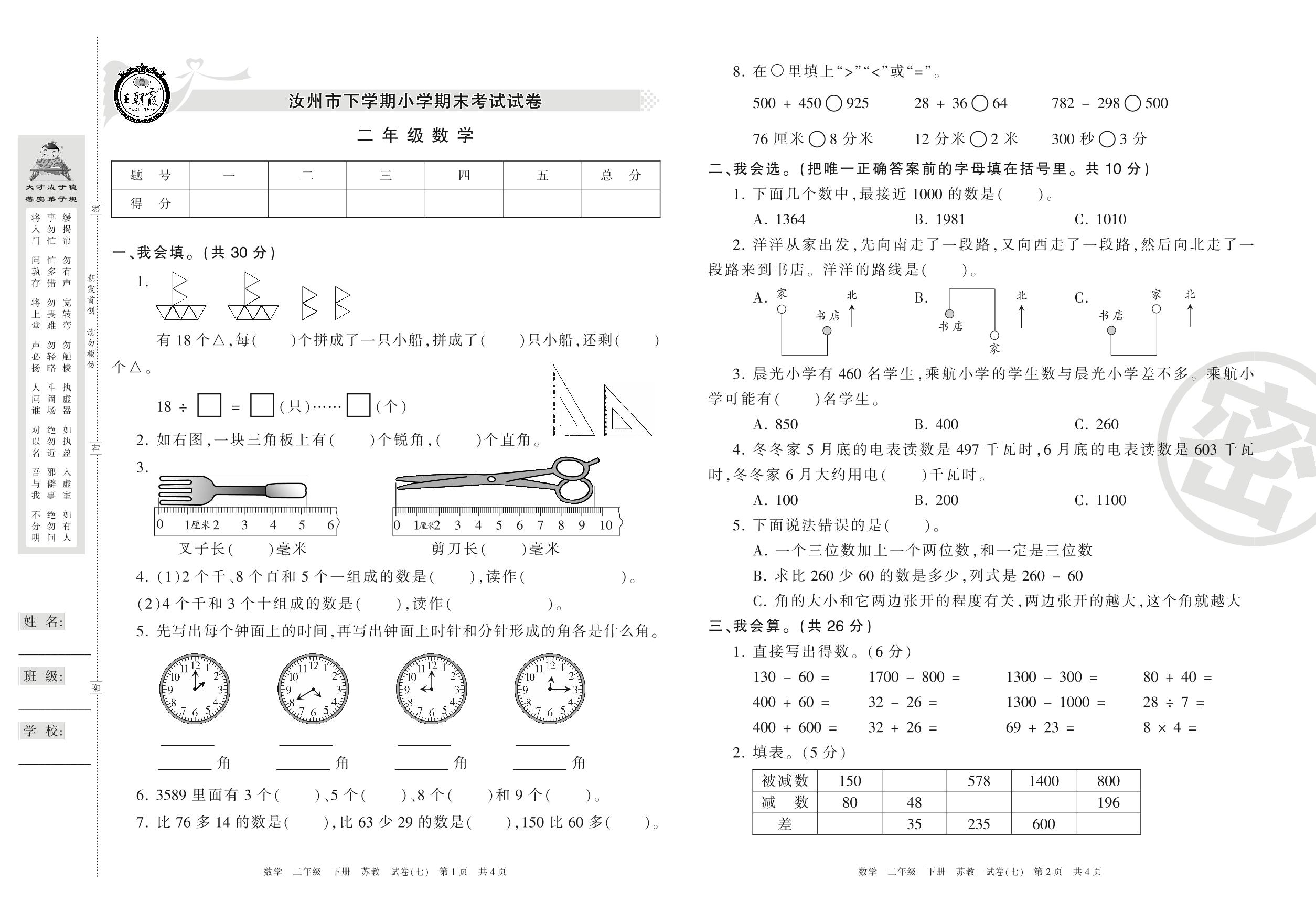 2015-2016学年第二学期汝州市二年级数学试卷(苏教版)【7】