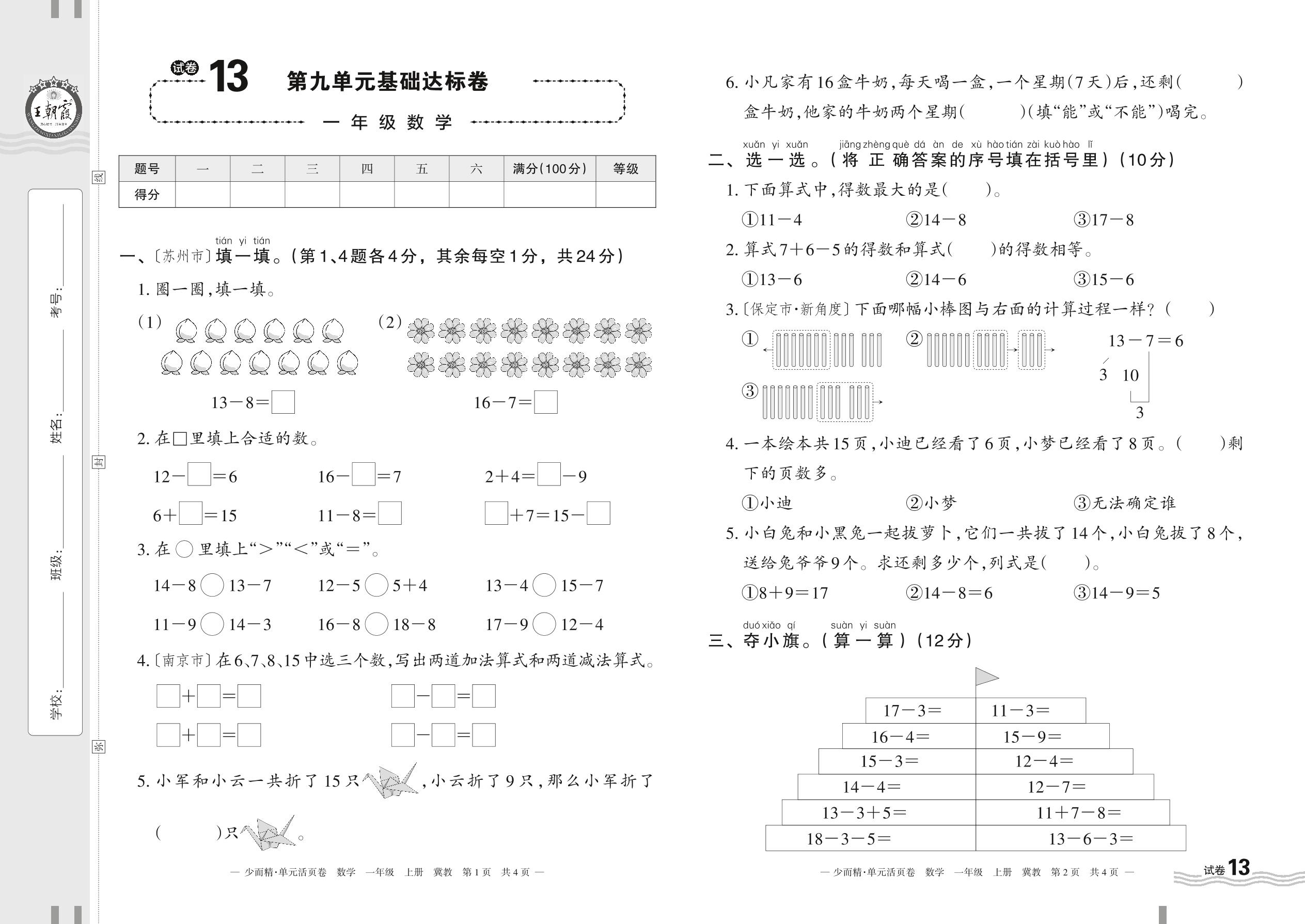 2023上册一年级数学冀教版 试卷13 第九单元基础达标卷