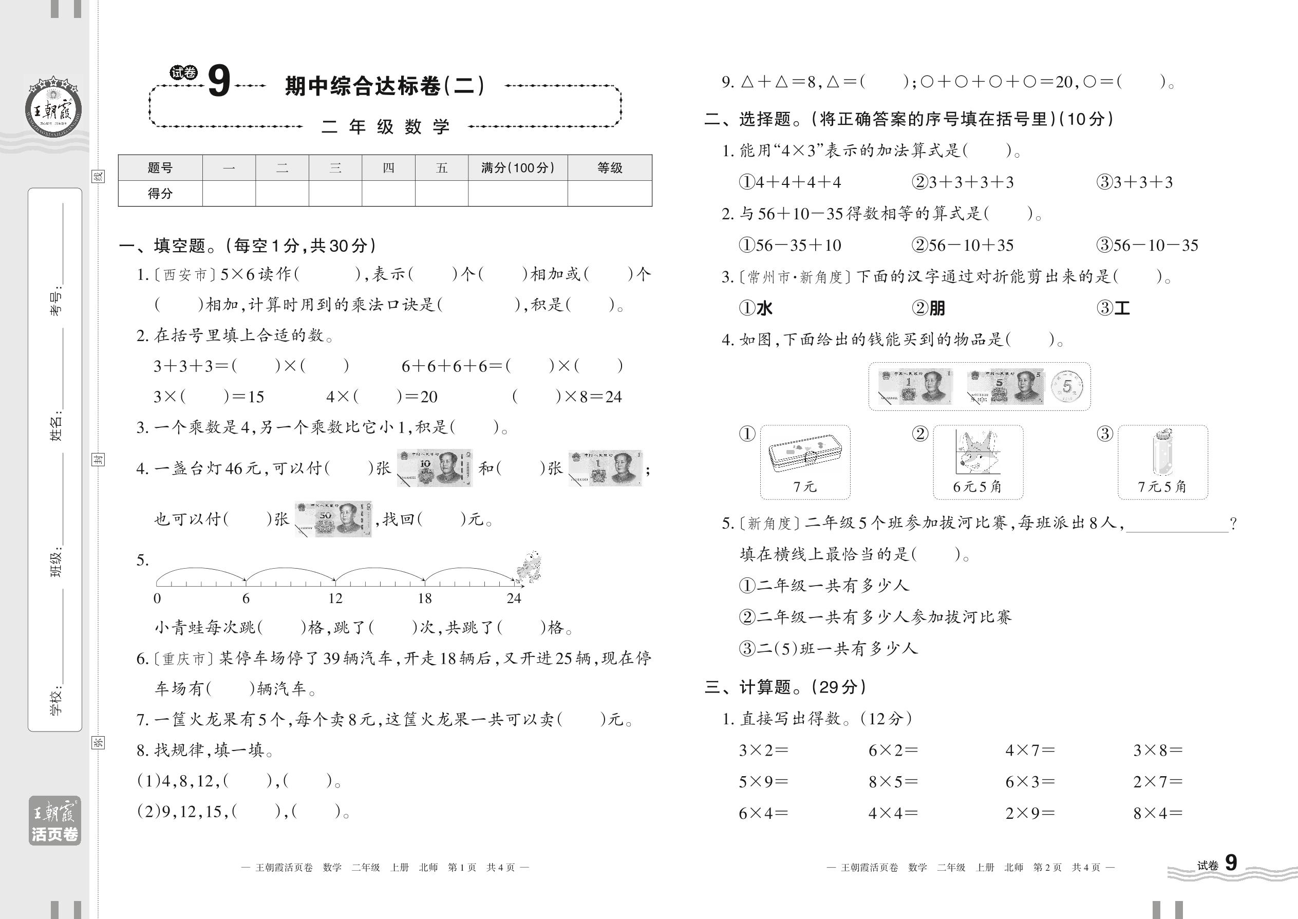2023上册二年级数学北师版 试卷9 期中综合达标卷(二)