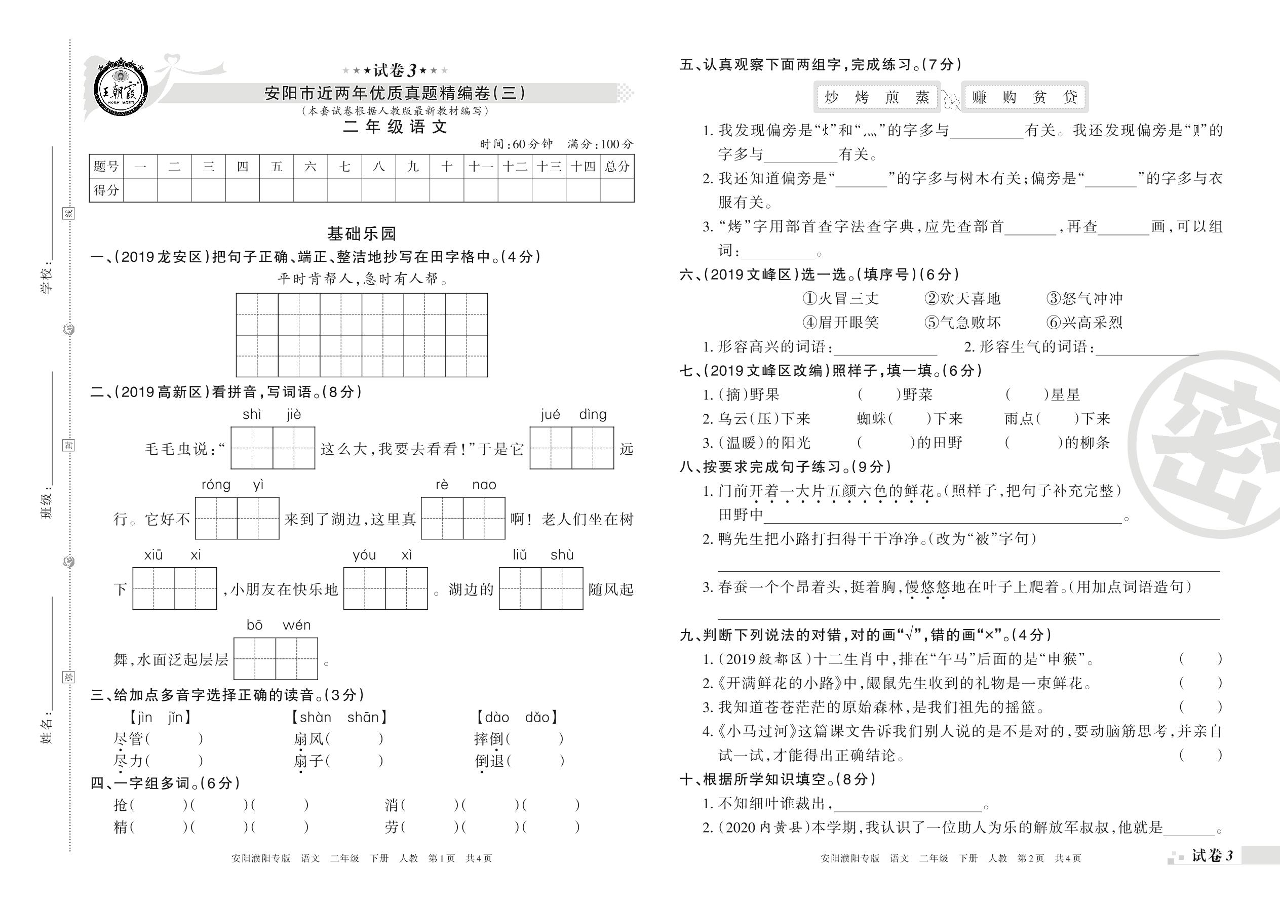 安阳市近两年优质真题精编卷(三)二年级下册语文(人教版)【3】