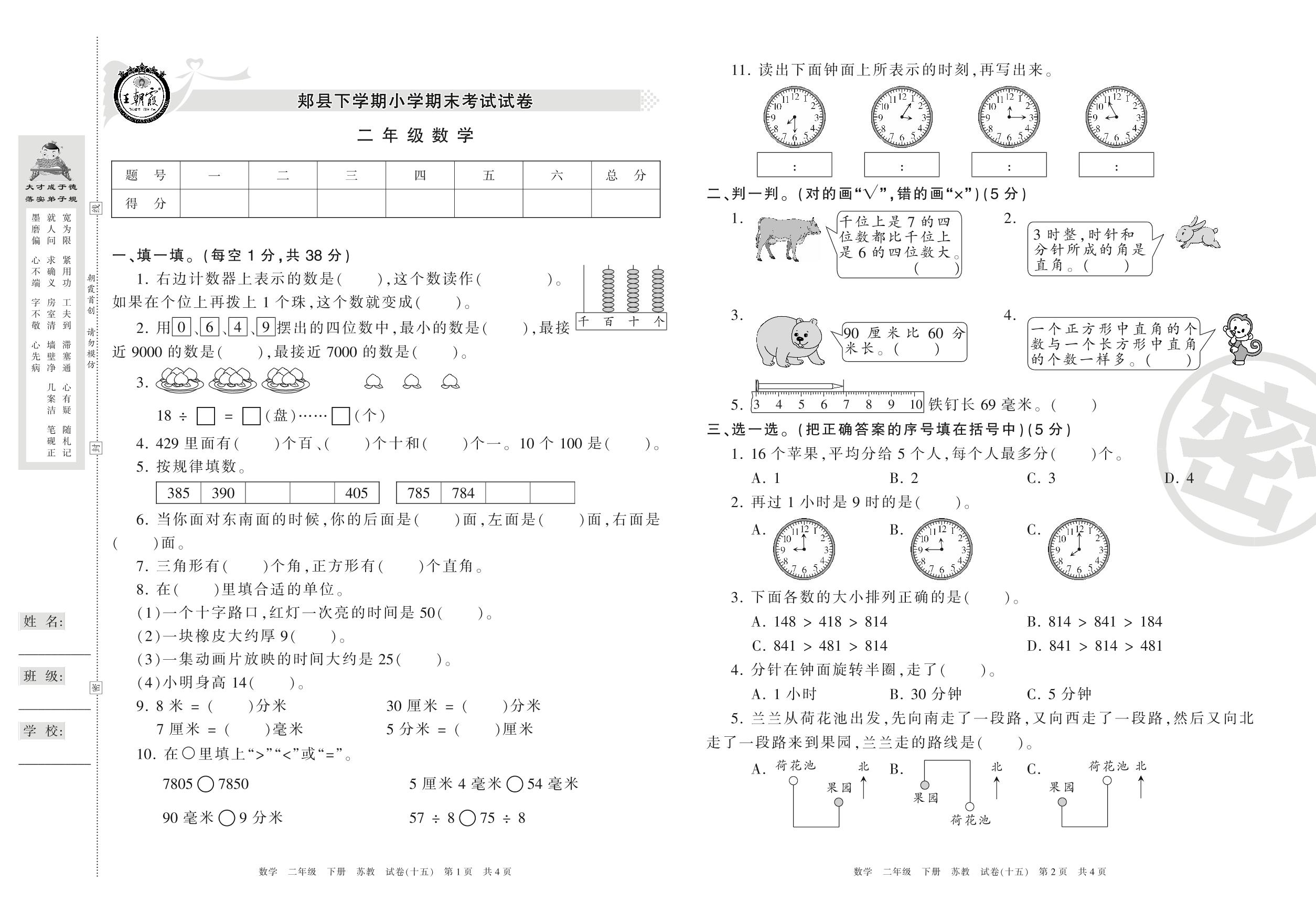 二年级数学苏教版下册期末卷