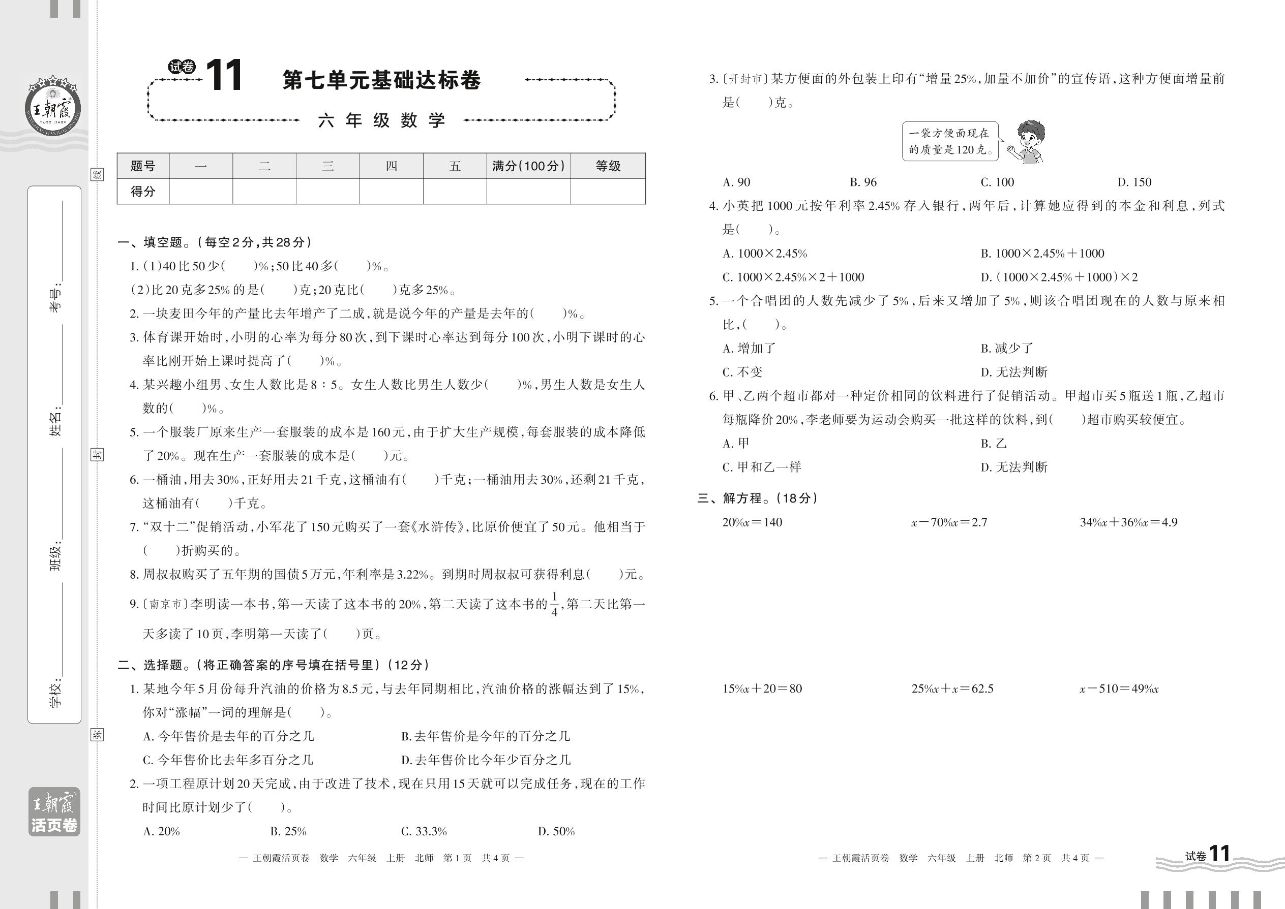 2023上册六年级数学北师版 试卷11 第七单元基础达标卷