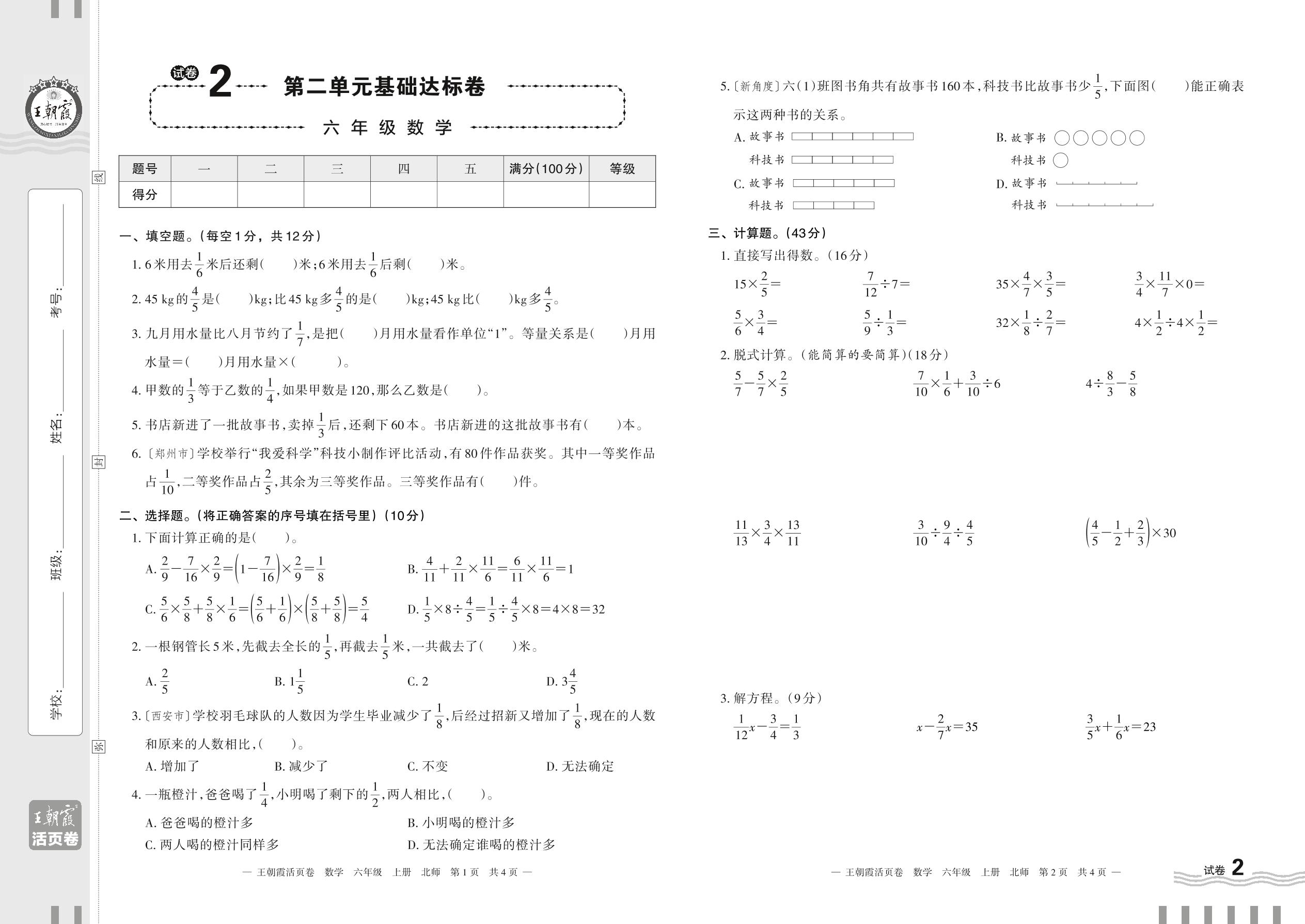 2023上册六年级数学北师版 试卷2 第二单元基础达标卷