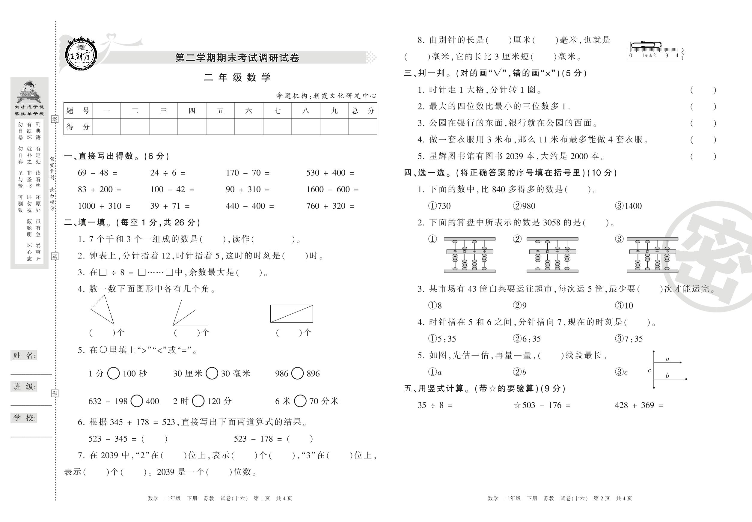 王朝霞期末调研卷二年级下册数学(苏教版)【16】
