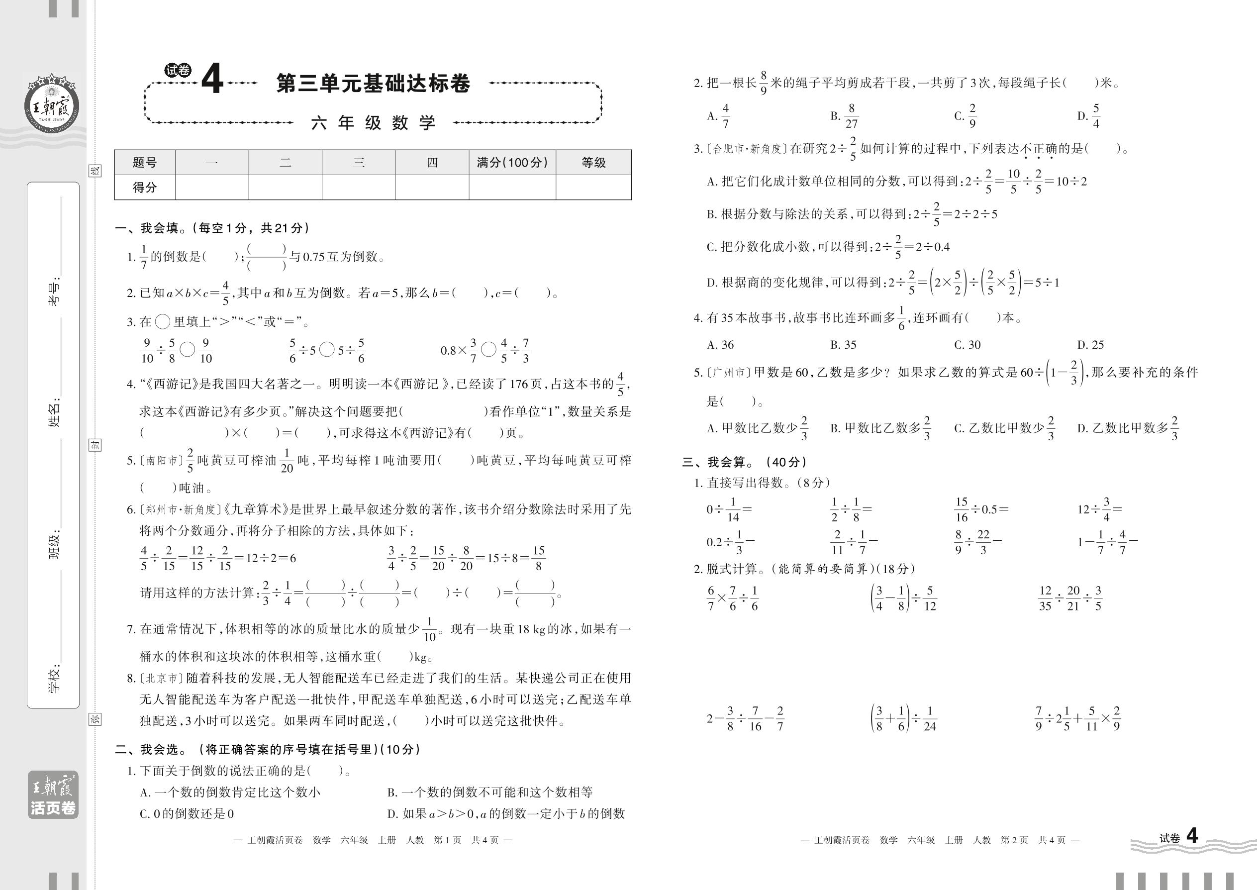 2023上册六年级数学人教版 试卷4 第三单元基础达标卷