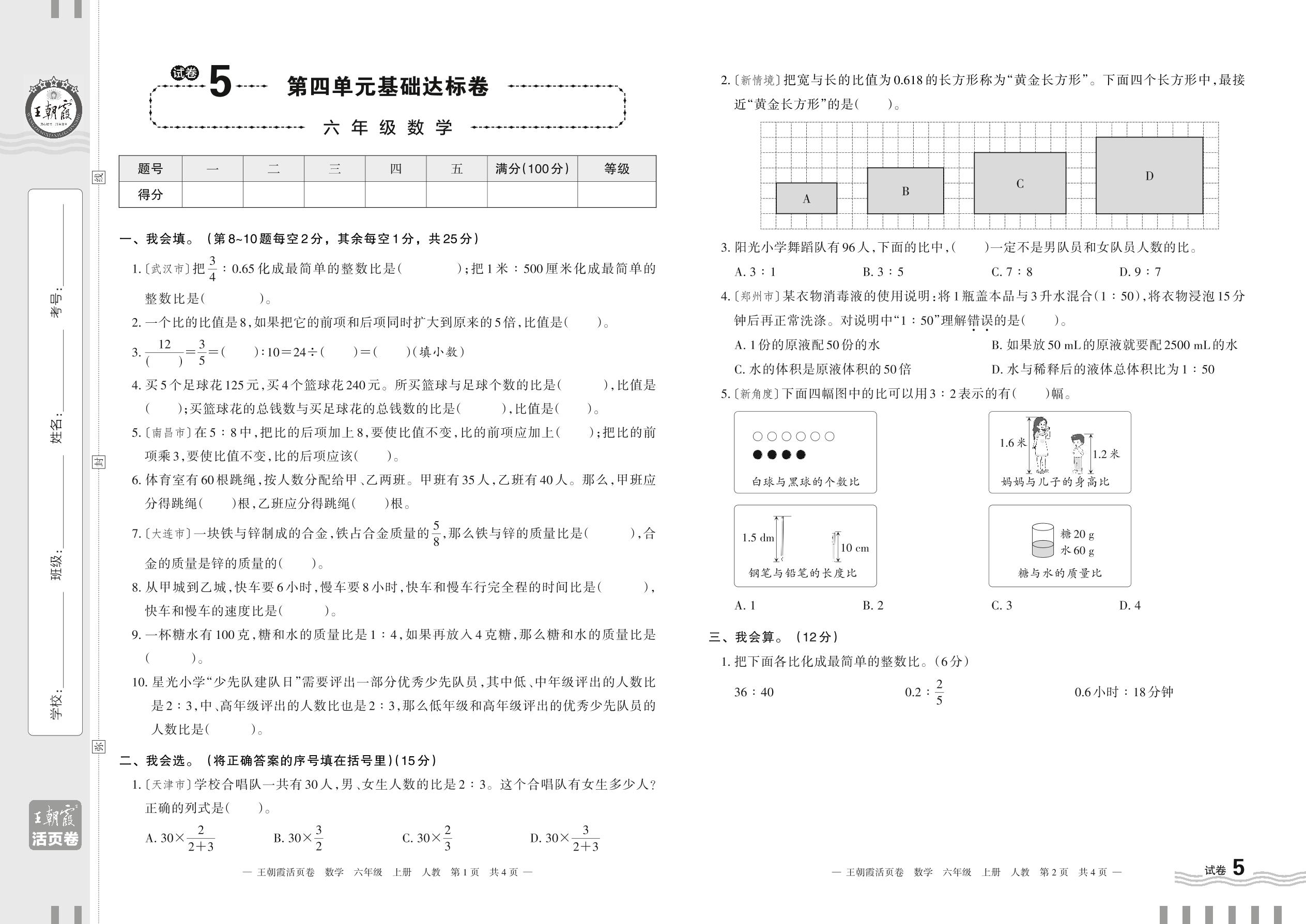 2023上册六年级数学人教版 试卷5 第四单元基础达标卷