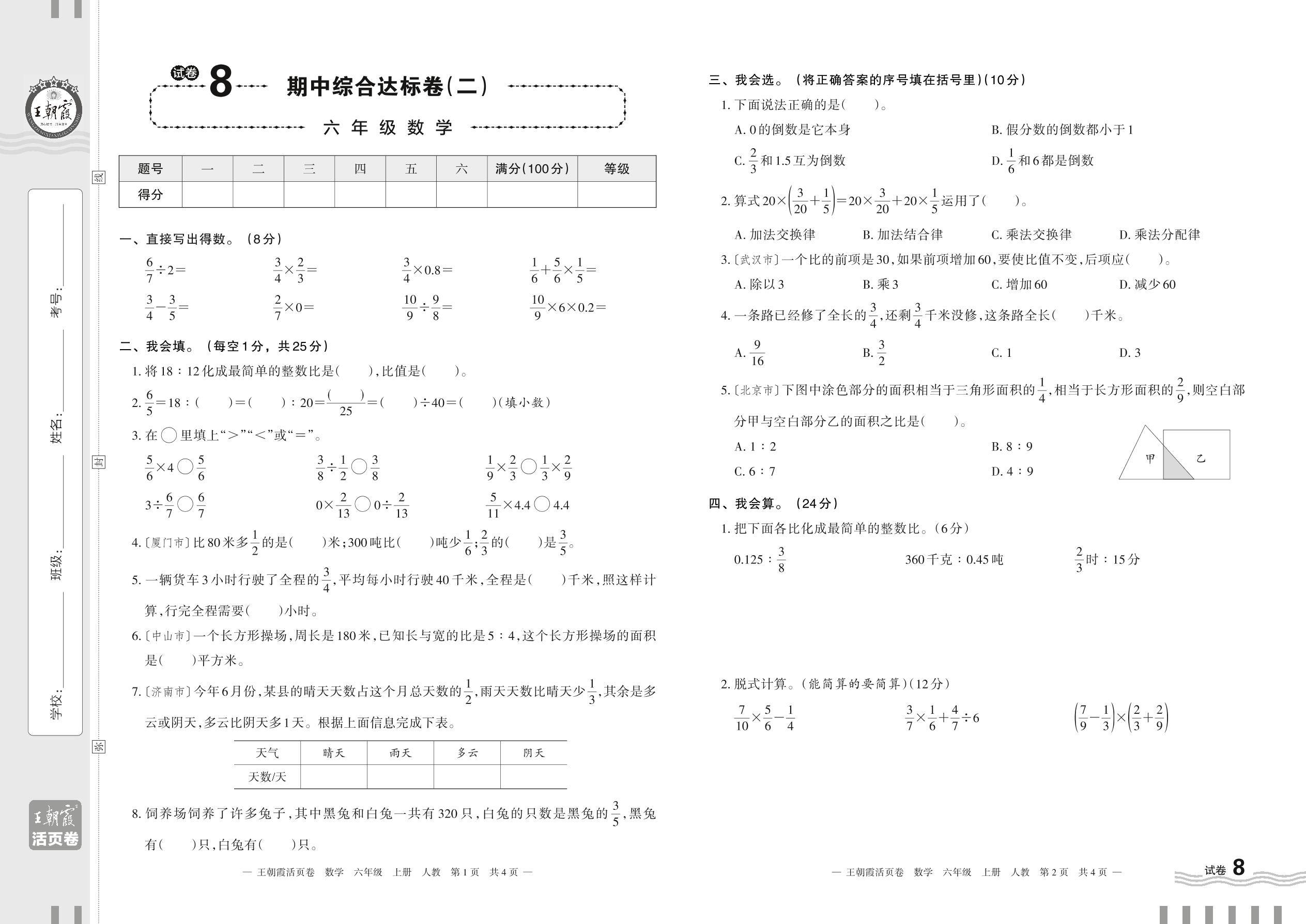 2023上册六年级数学人教版 试卷8 期中综合达标卷(二)