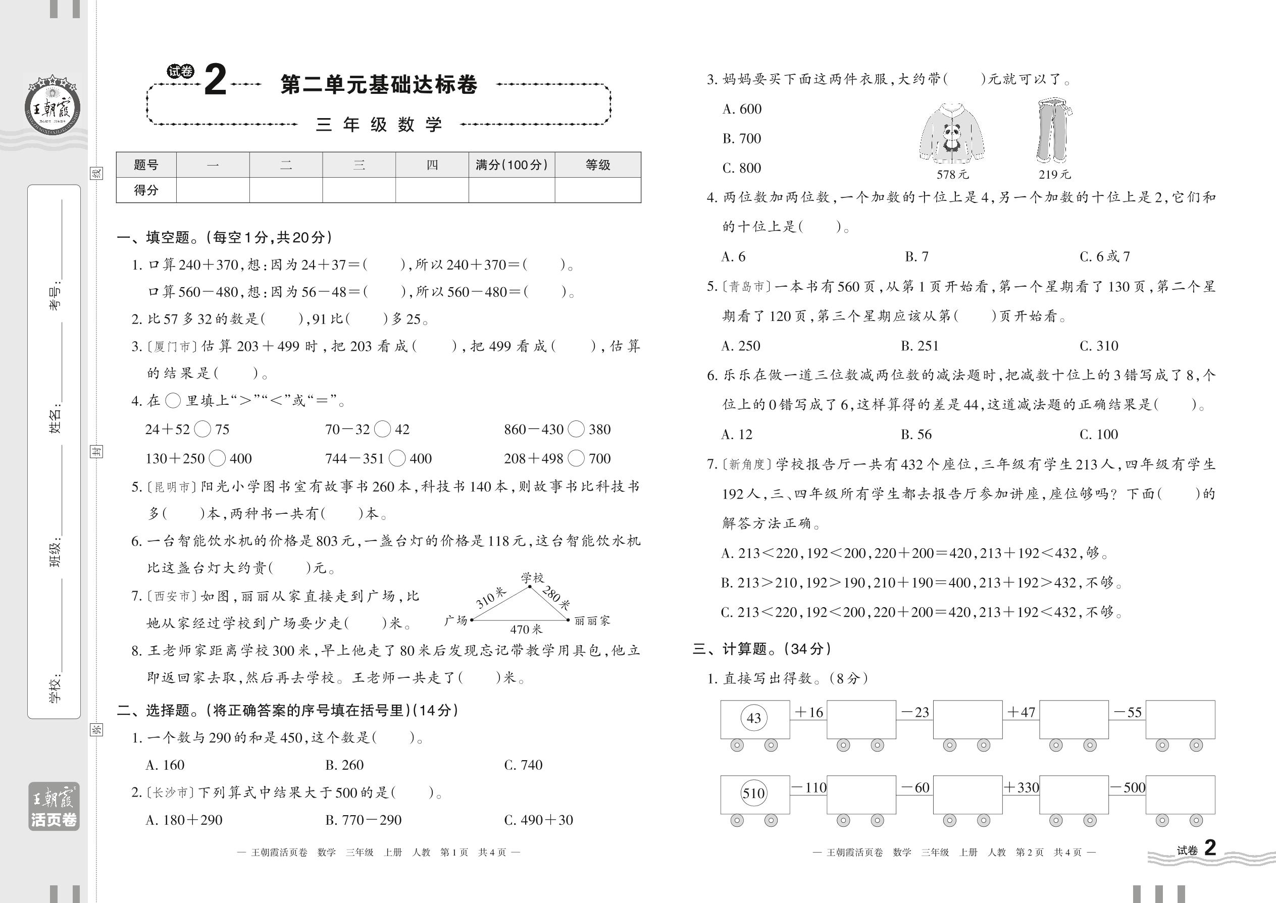 2023上册三年级数学人教版 试卷2 第二单元基础达标卷