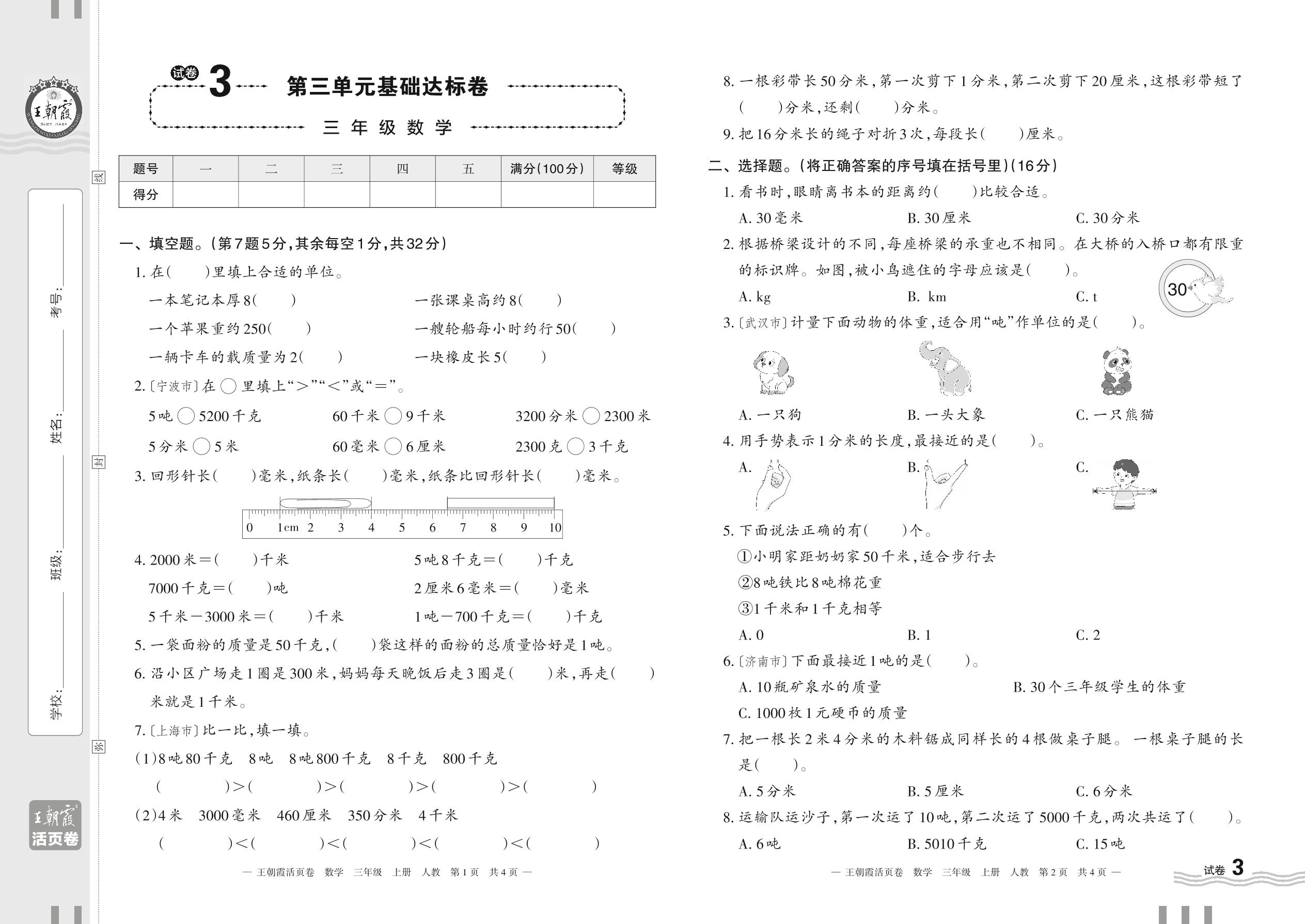 2023上册三年级数学人教版 试卷3 第三单元基础达标卷