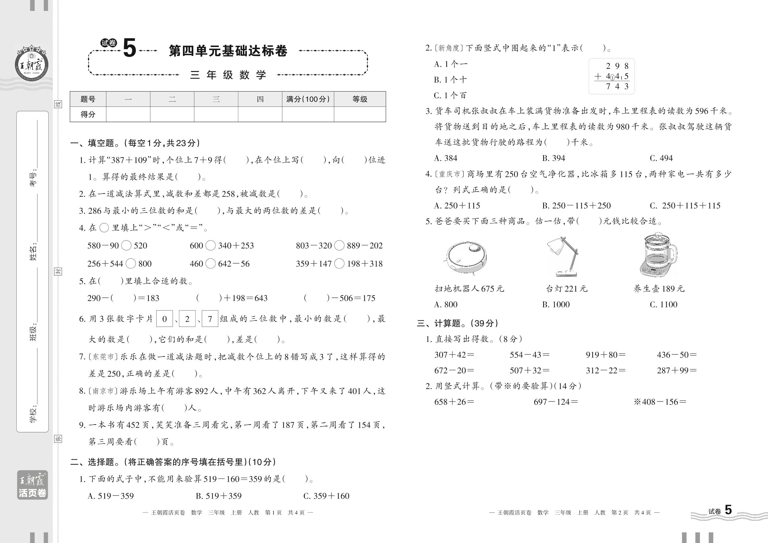 2023上册三年级数学人教版 试卷5 第四单元基础达标卷