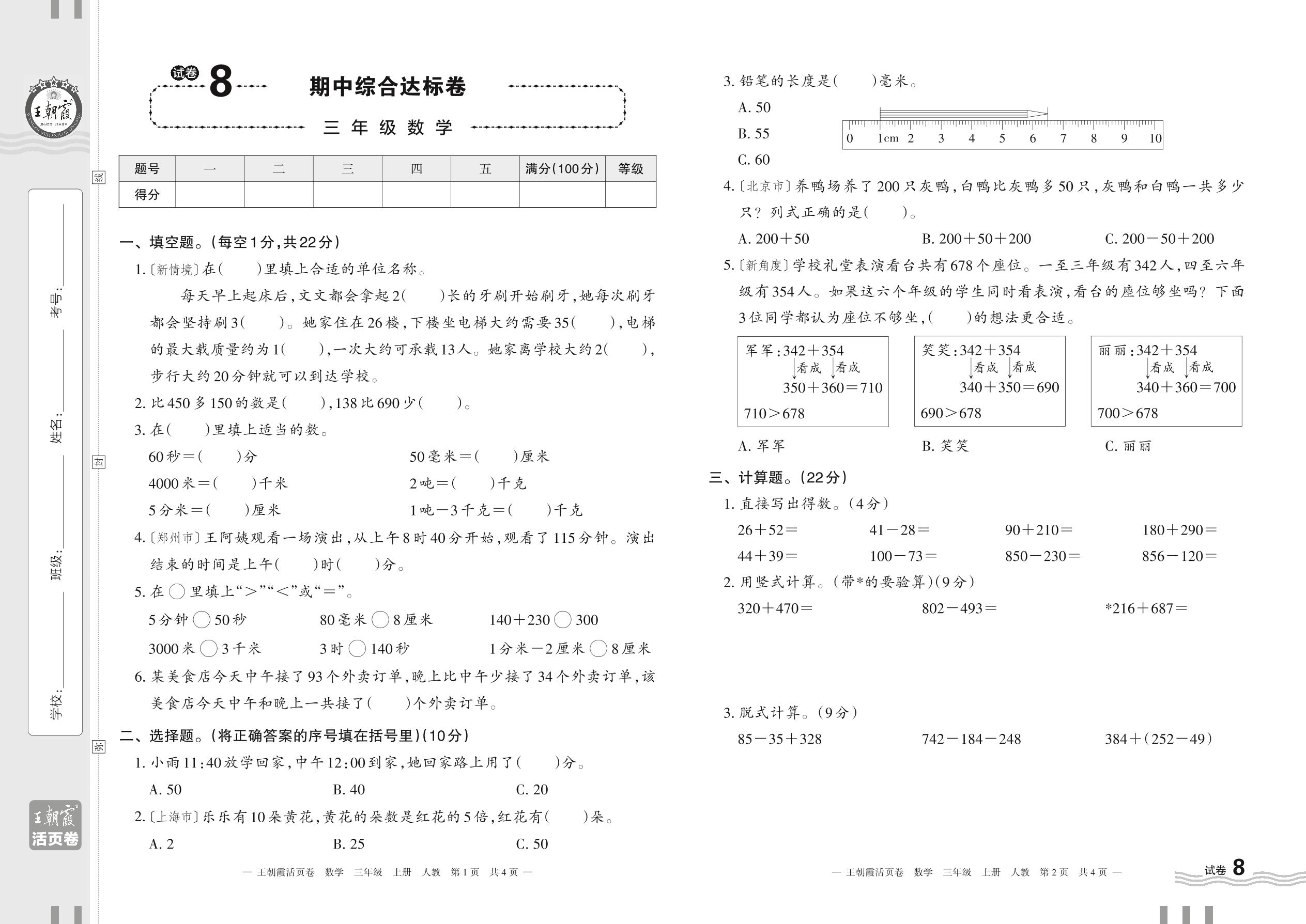 2023上册三年级数学人教版 试卷8 期中综合达标卷