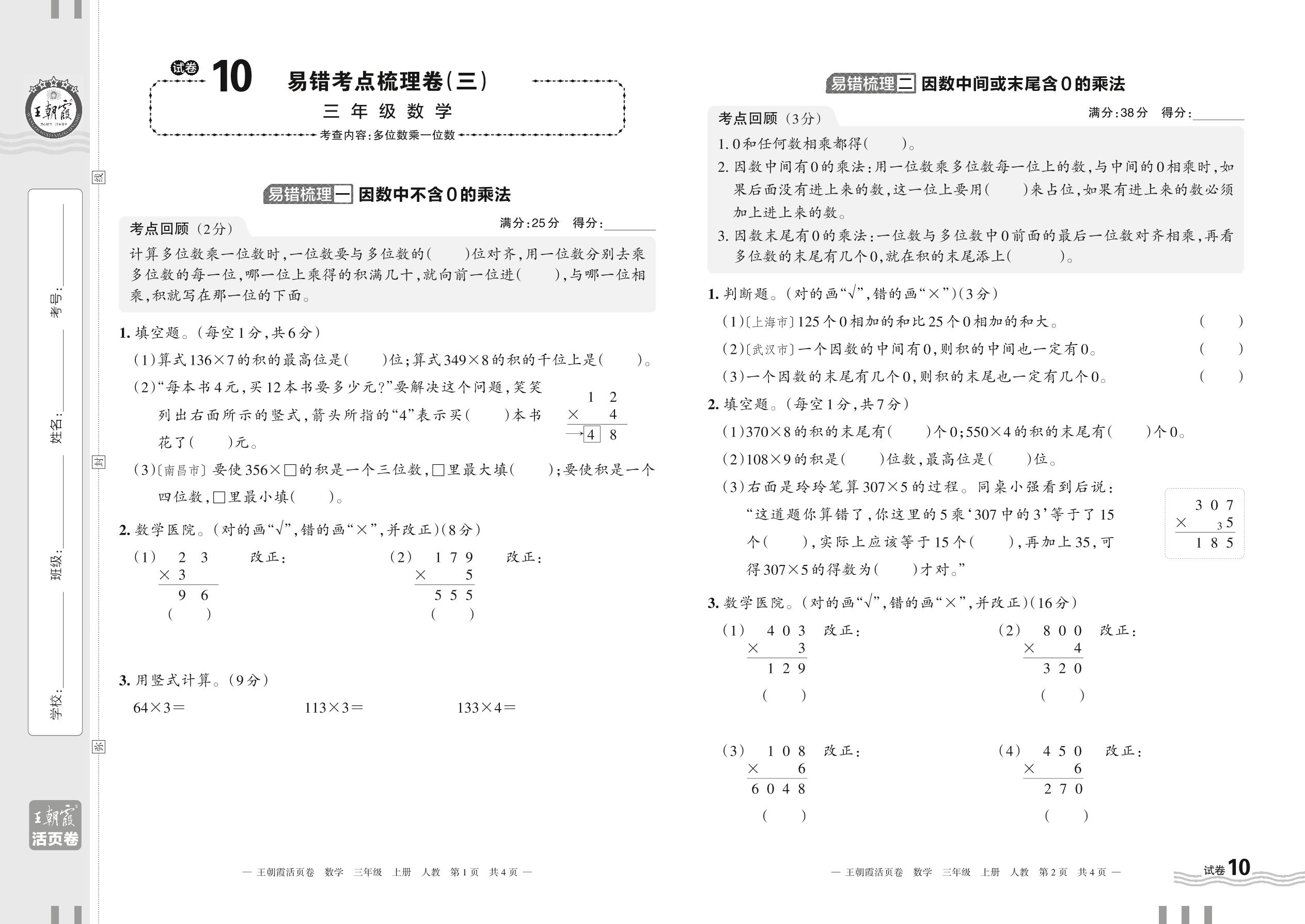 2023上册三年级数学人教版 试卷10 易错考点梳理卷(三)
