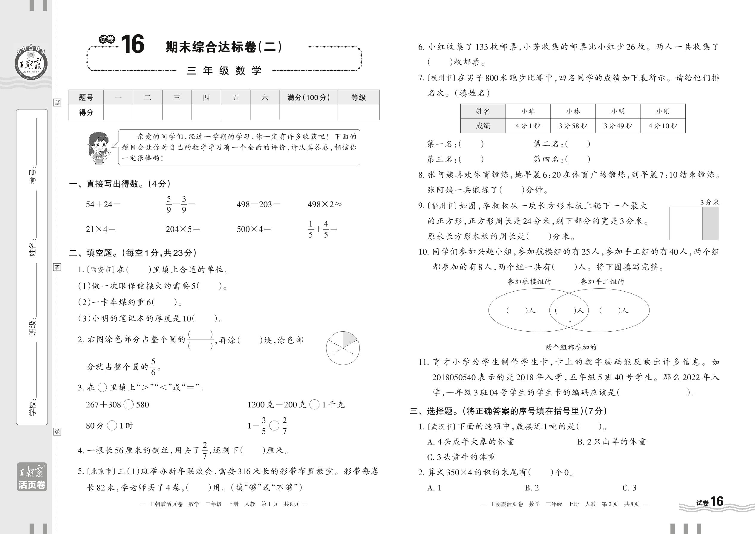 2023上册三年级数学人教版 试卷16 期末综合达标卷(二)