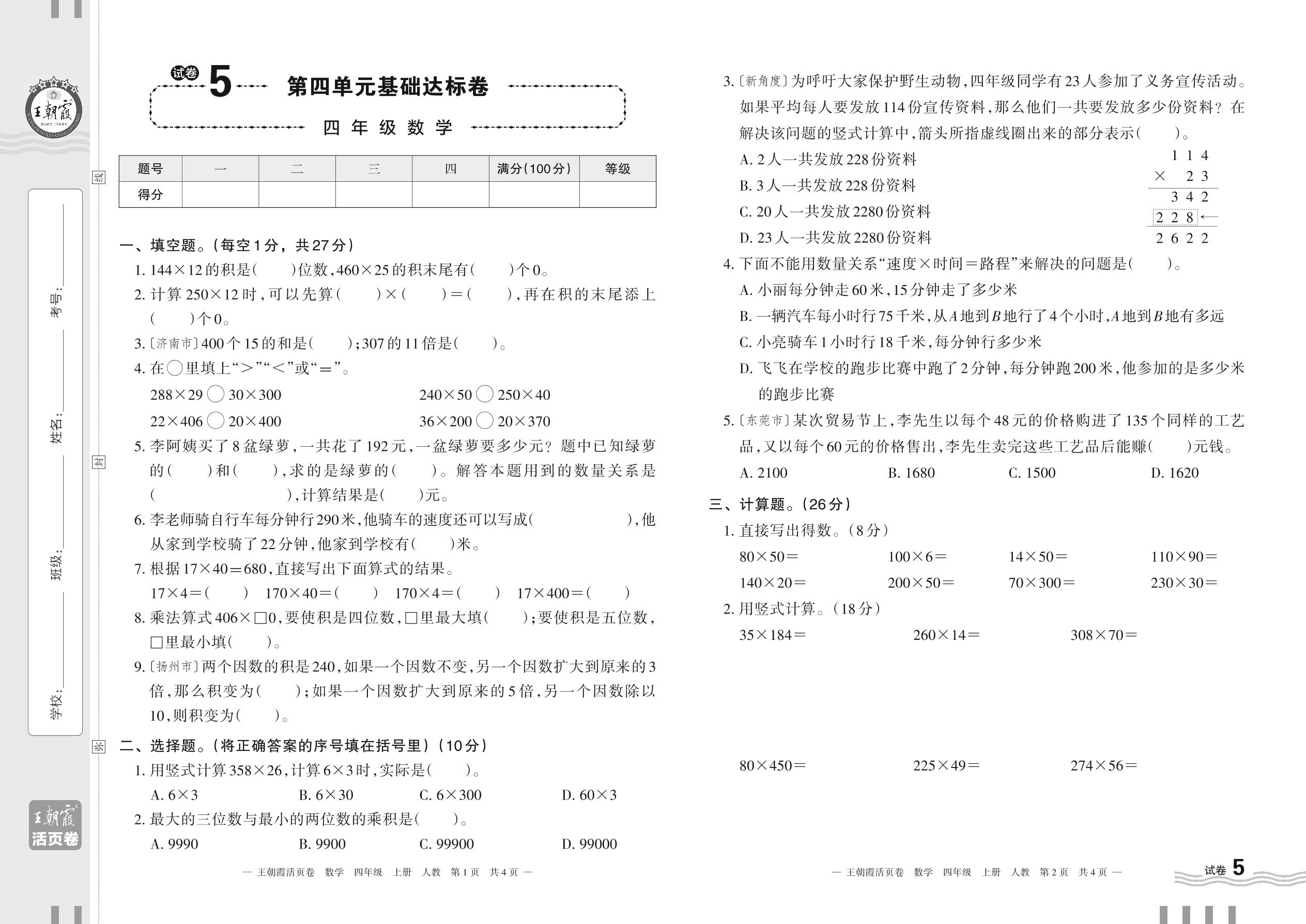 2023上册四年级数学人教版 试卷5 第四单元基础达标卷