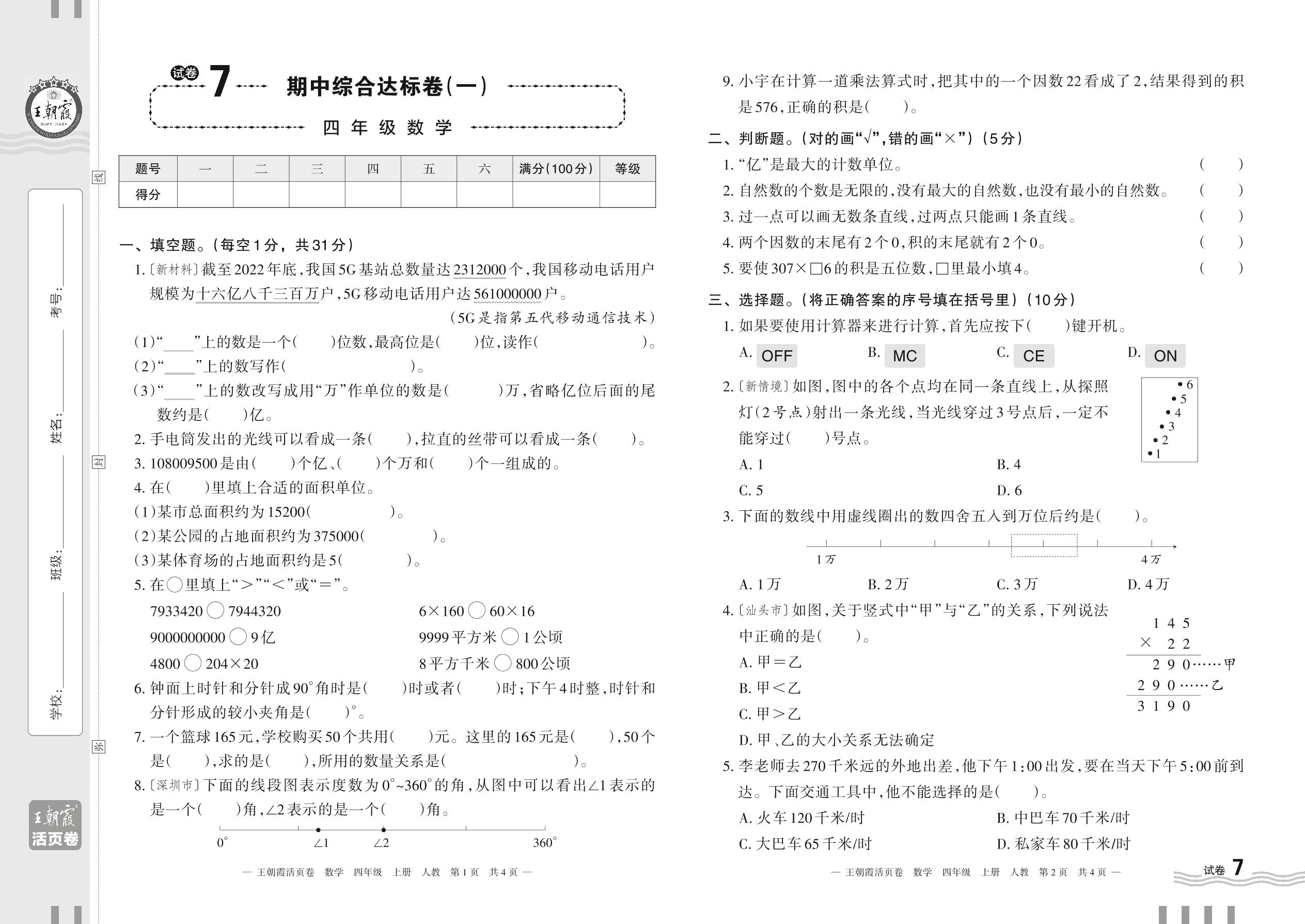 2023上册四年级数学人教版 试卷7 期中综合达标卷(一)
