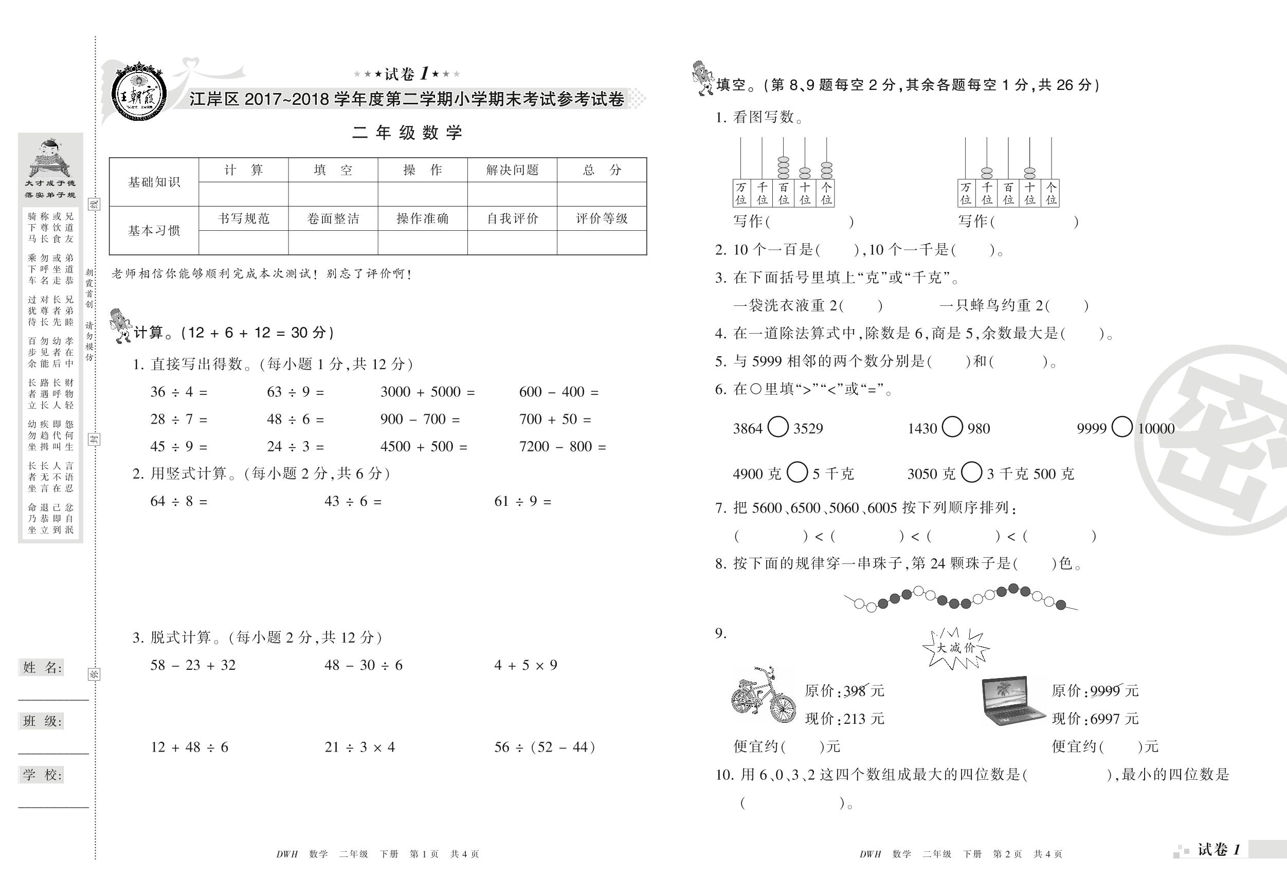 2017-2018学年第二学期武汉市江岸区二年级数学试卷(人教版)【1】