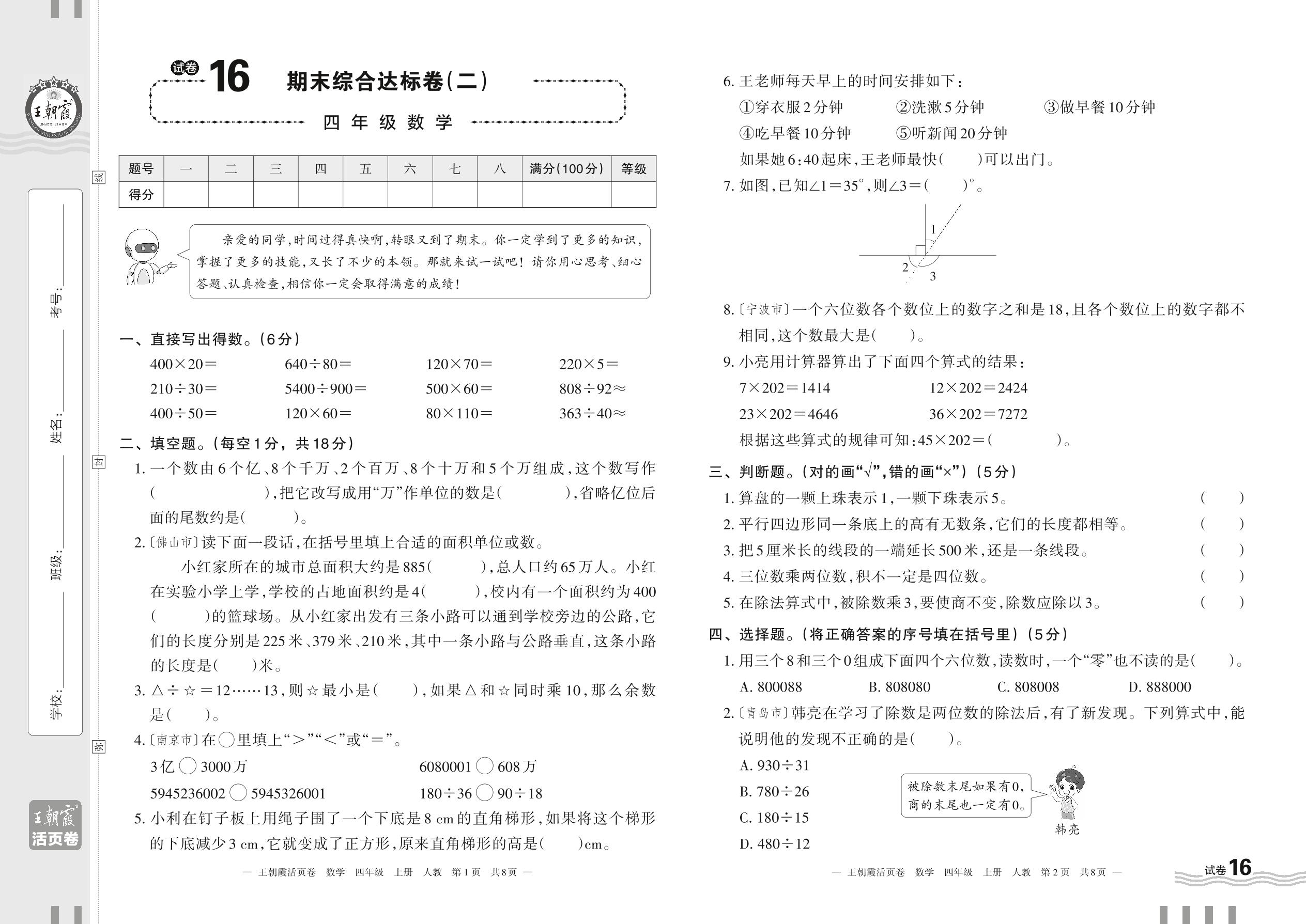 2023上册四年级数学人教版 试卷16 期末综合达标卷(二)