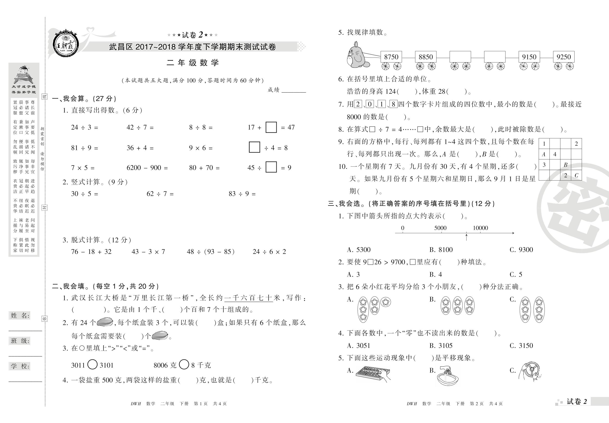 2017-2018学年第二学期武汉市武昌区二年级数学试卷(人教版)【2】