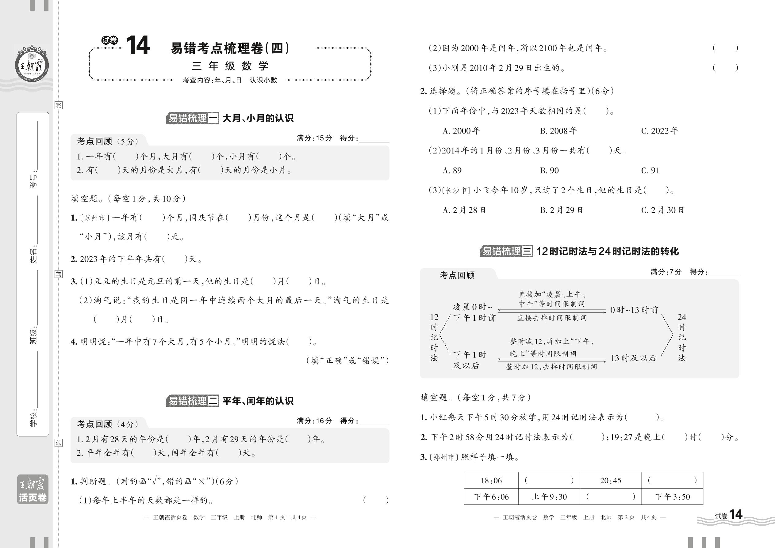 2023上册三年级数学北师版 试卷14 易错考点梳理卷(四)
