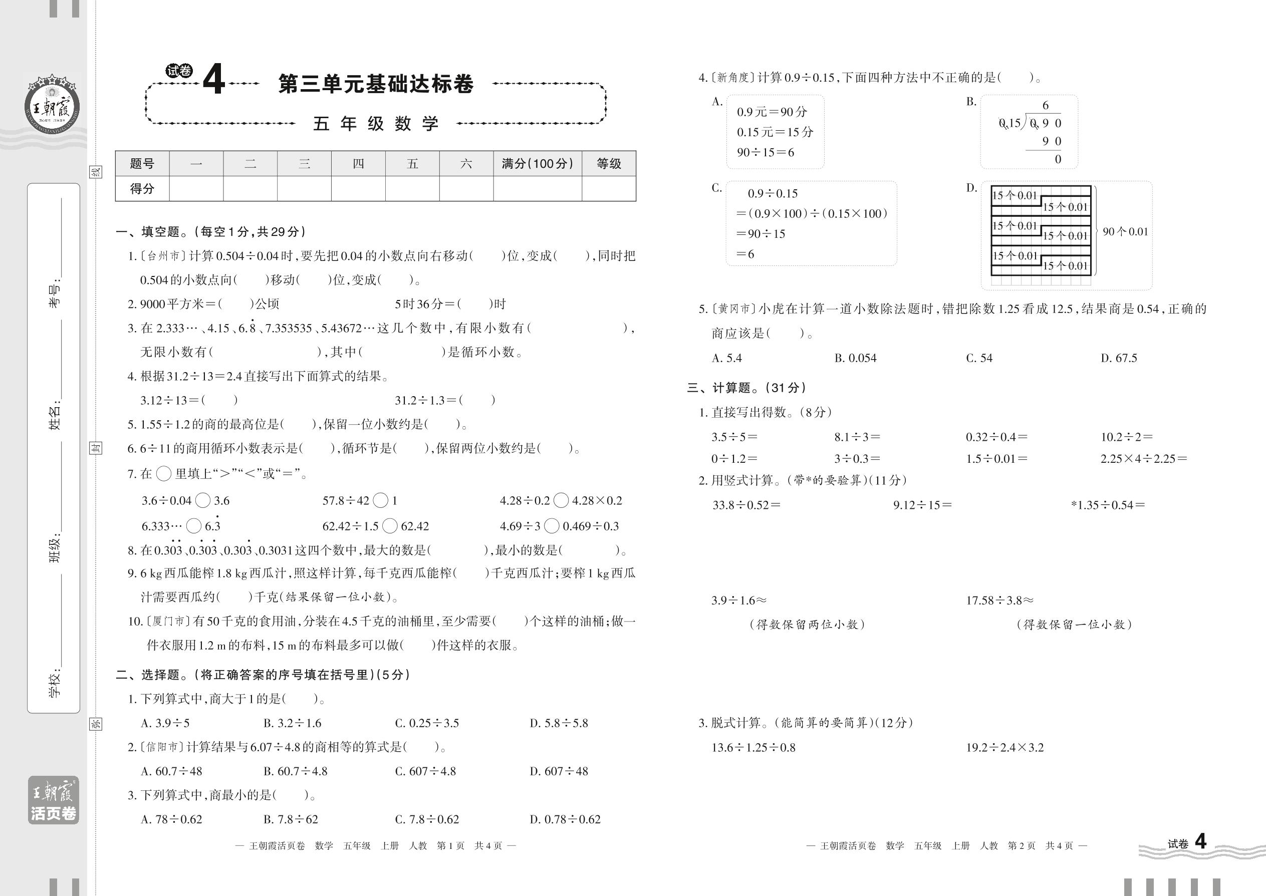 2023上册五年级数学人教版 试卷4 第三单元基础达标卷