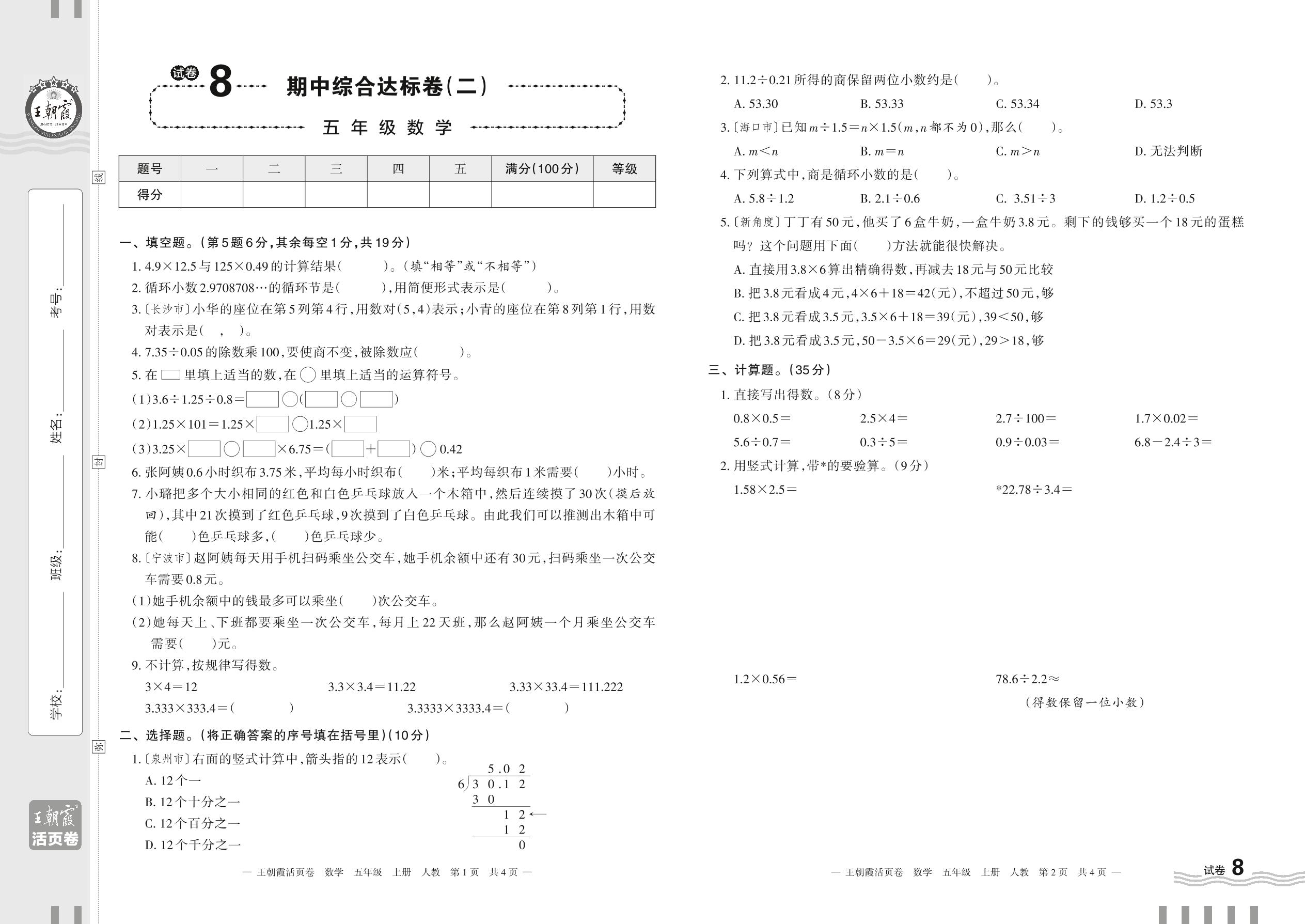 2023上册五年级数学人教版 试卷8 期中综合达标卷(二)