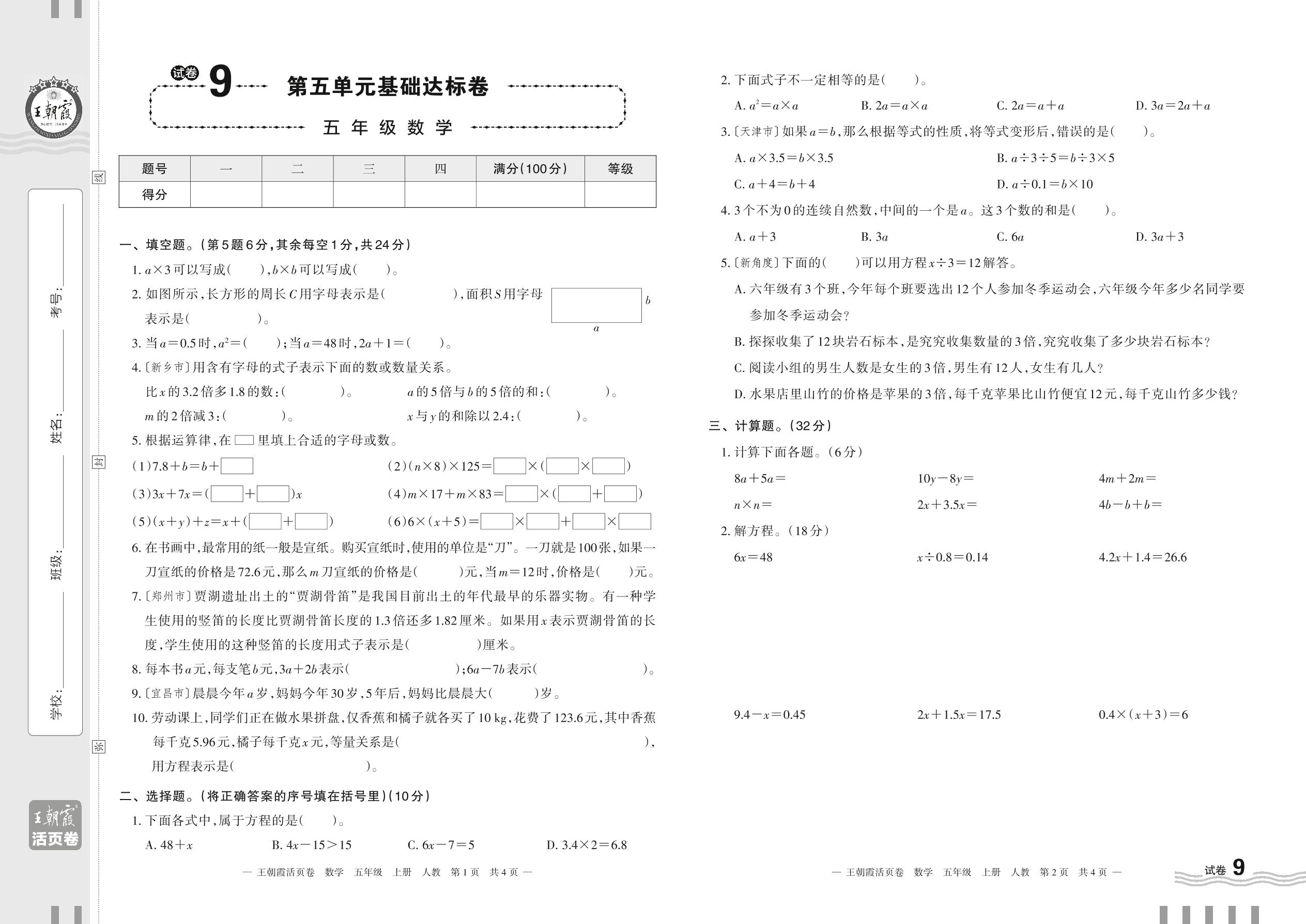 2023上册五年级数学人教版 试卷9 第五单元基础达标卷