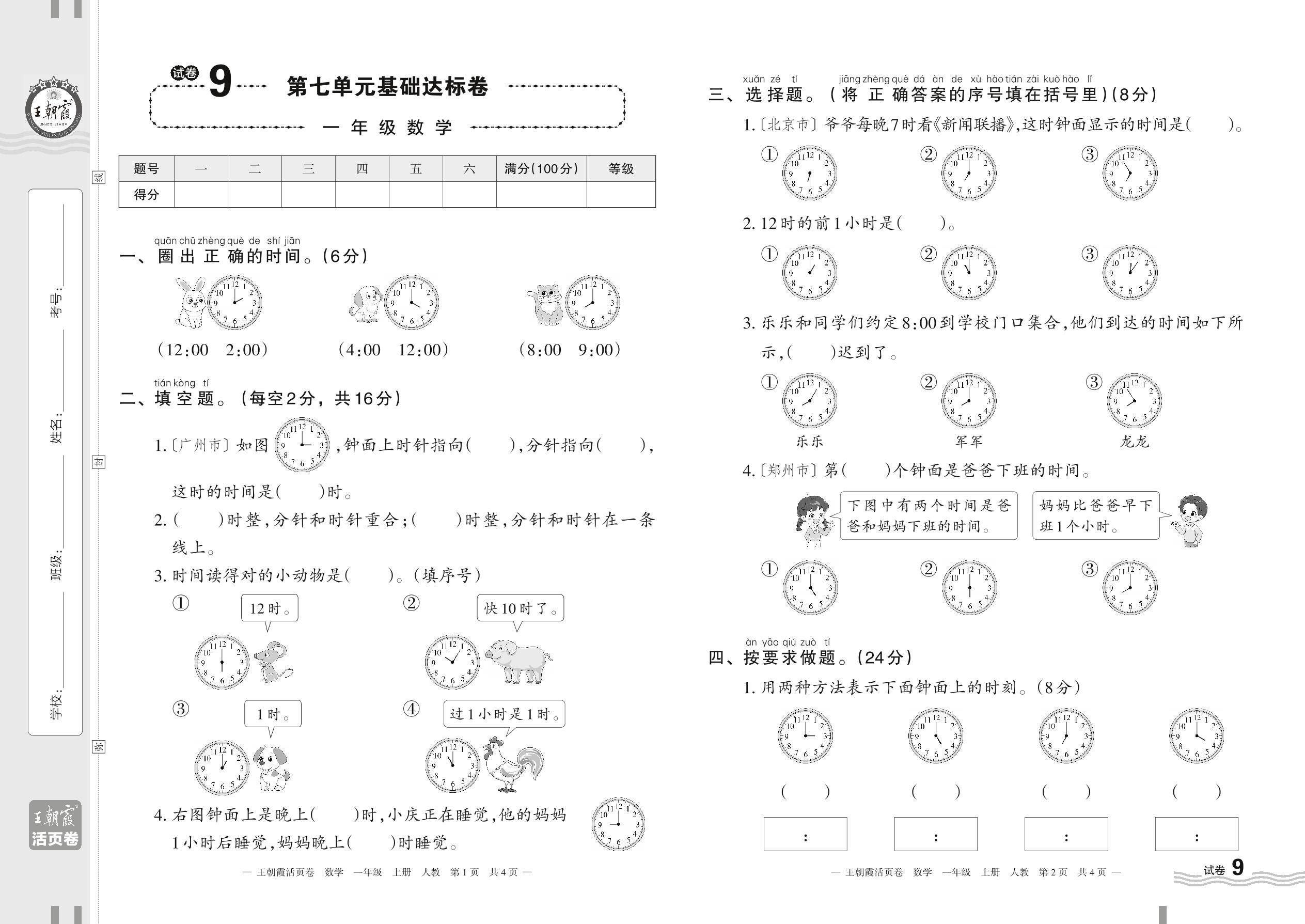 2023上册一年级数学人教版 试卷9 第七单元基础达标卷