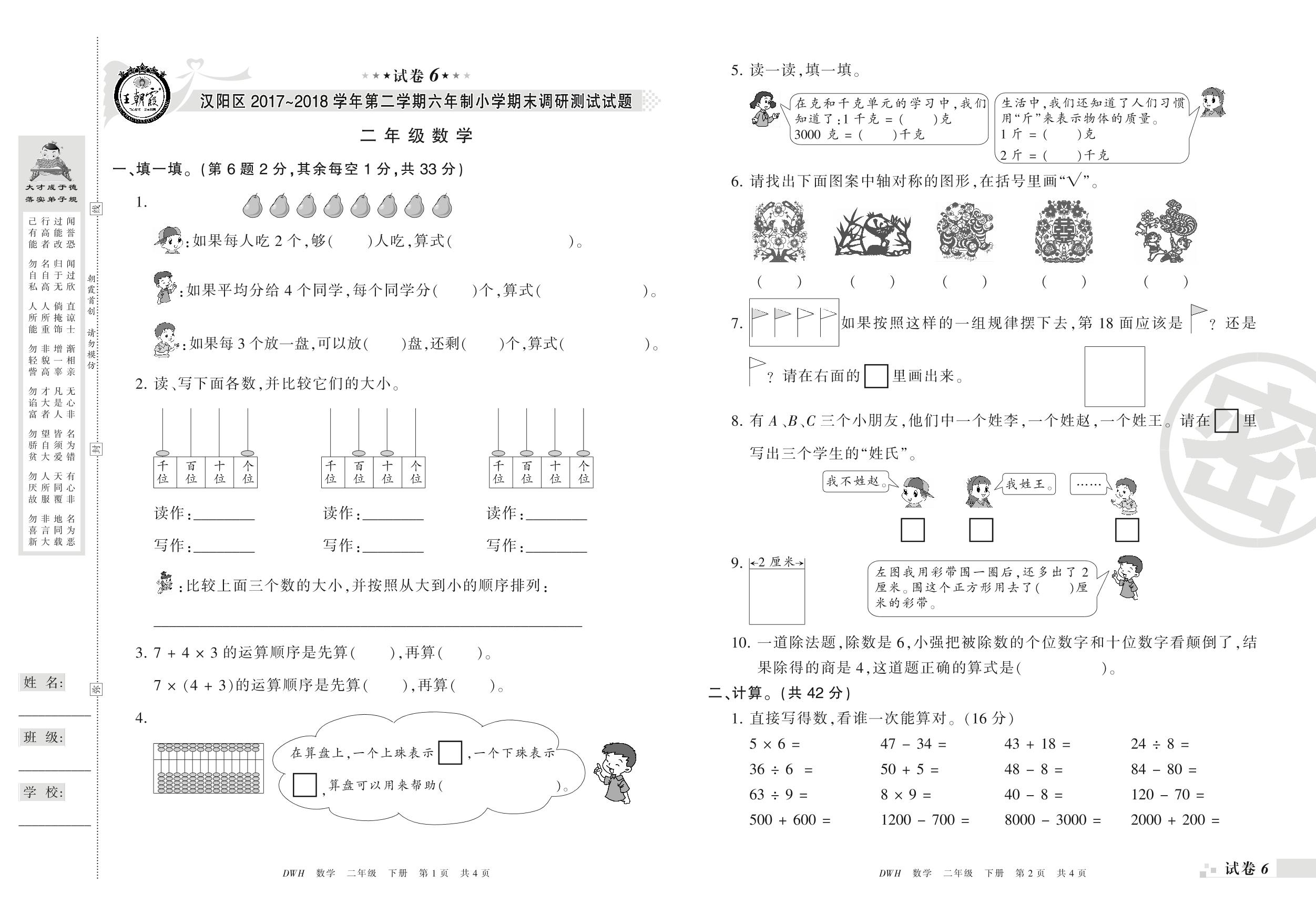 2017-2018学年第二学期武汉市汉阳区二年级数学试卷(人教版)【6】