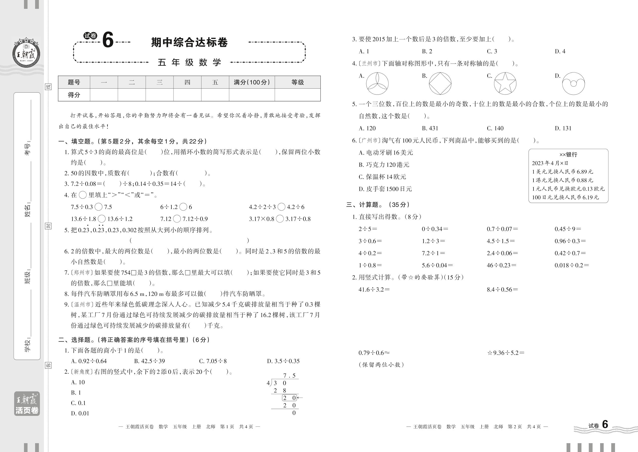 2023上册五年级数学北师版 试卷6 期中综合达标卷
