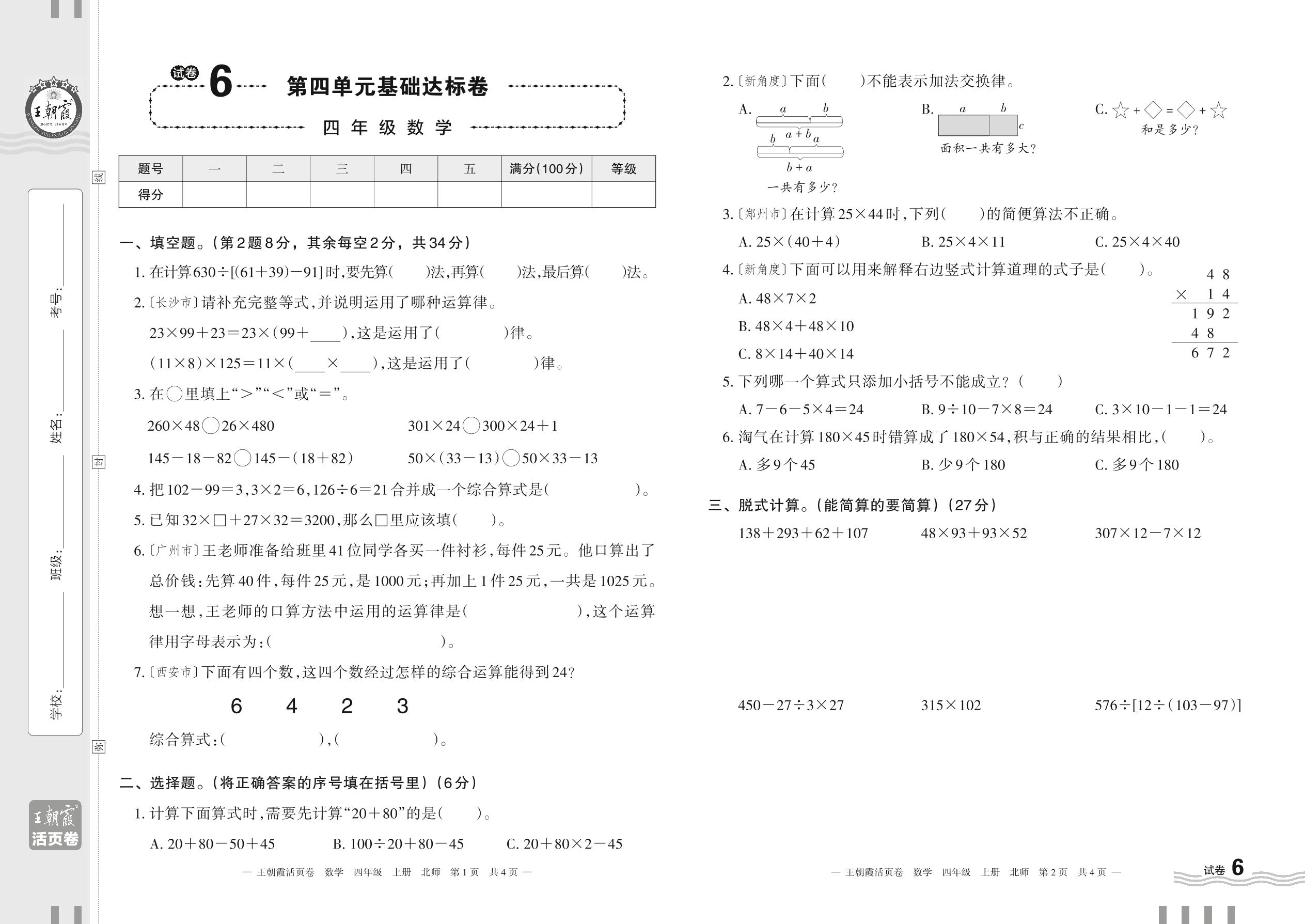 2023上册四年级数学北师版 试卷6 第四单元基础达标卷
