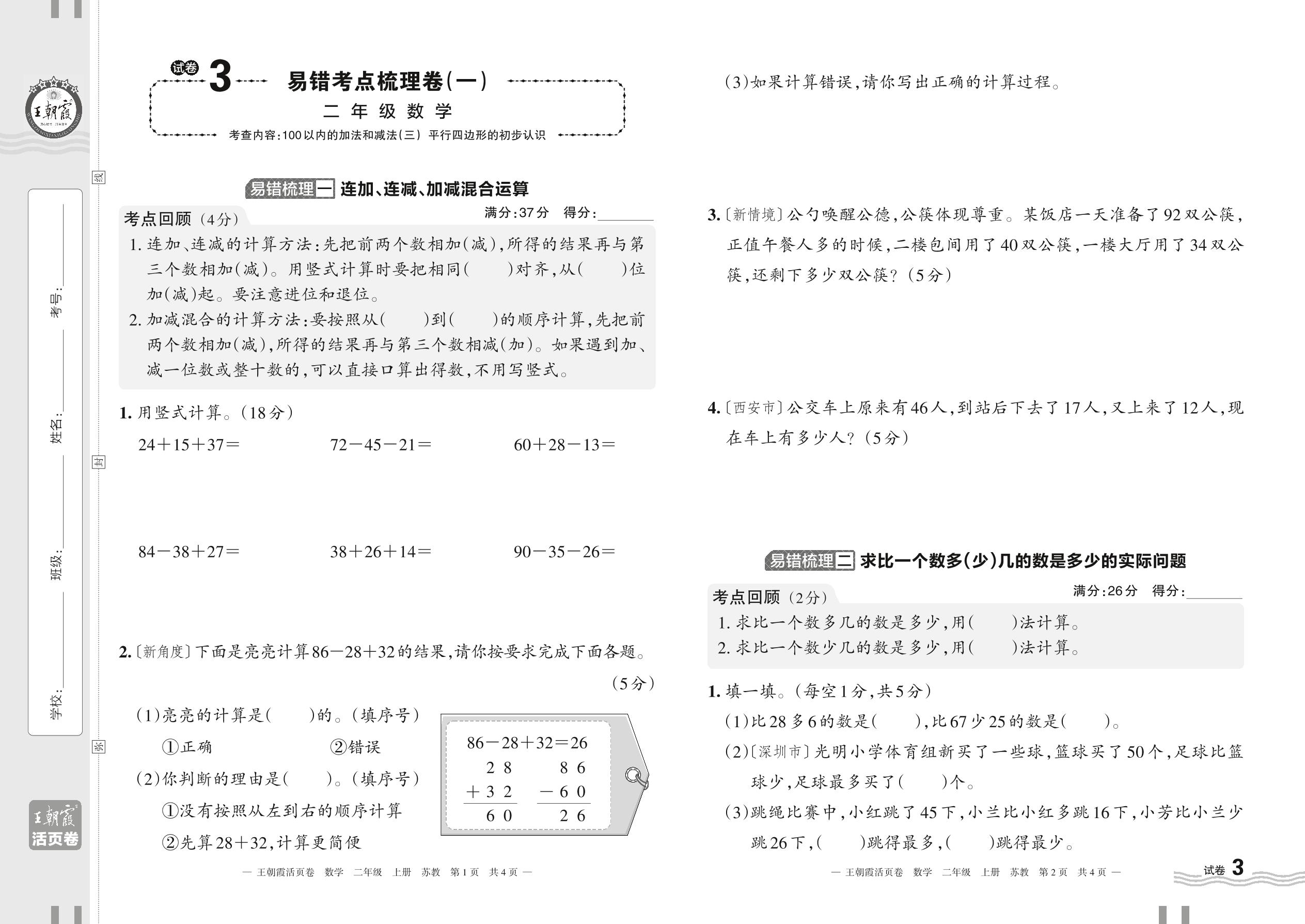 2023上册二年级数学苏教版 试卷3 易错考点梳理卷(一)
