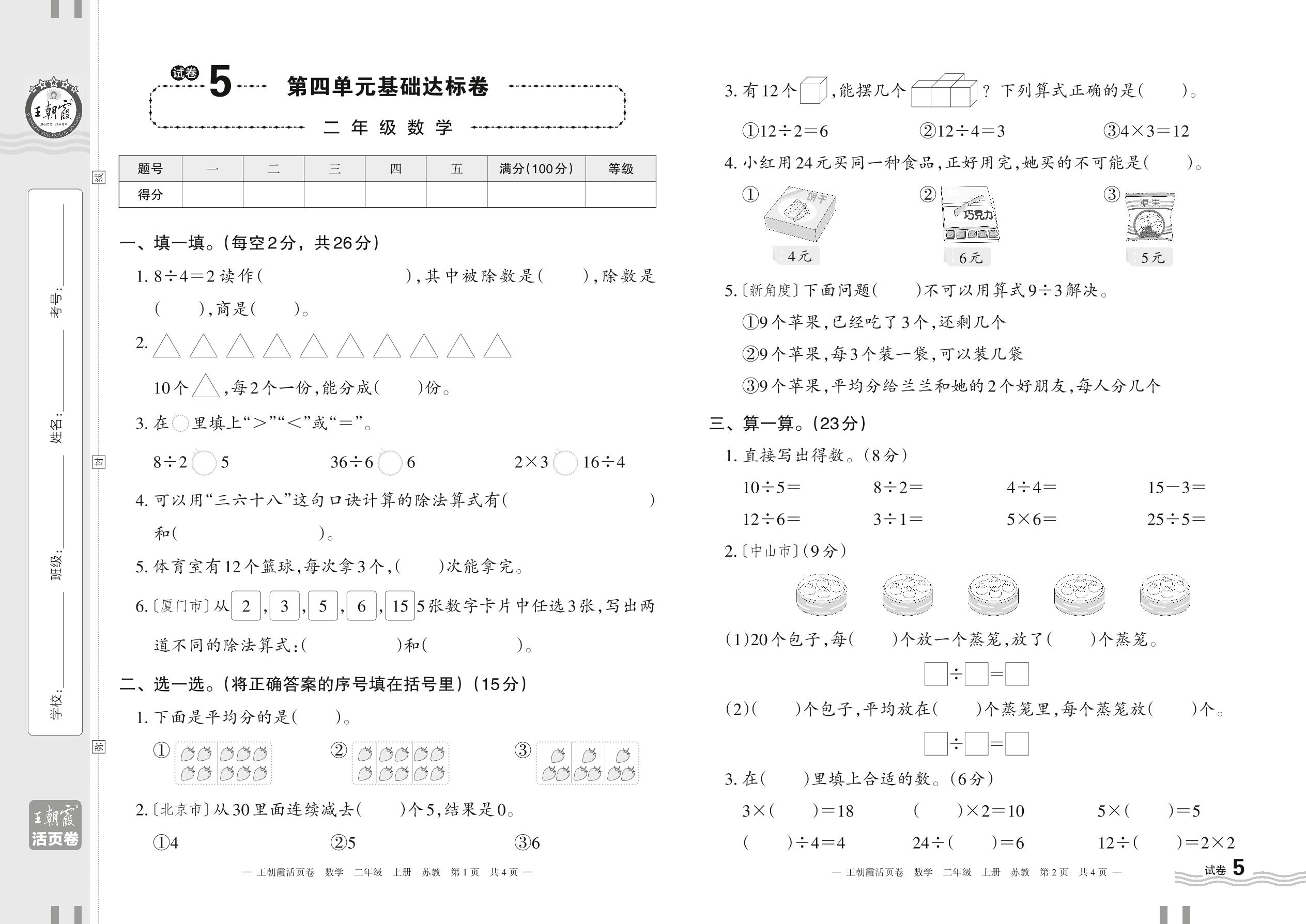 2023上册二年级数学苏教版 试卷5 第四单元基础达标卷