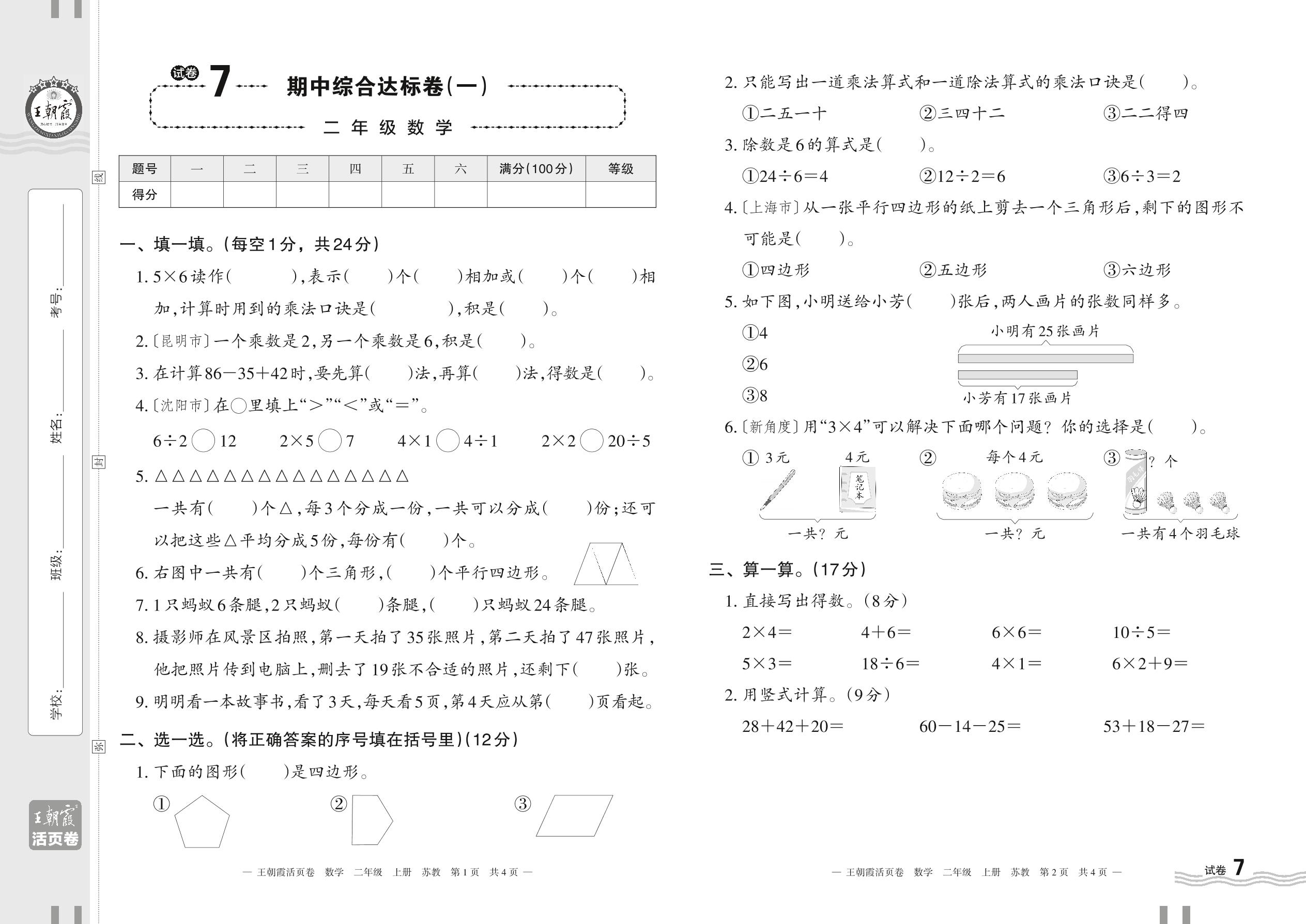 2023上册二年级数学苏教版 试卷7 期中综合达标卷(一)