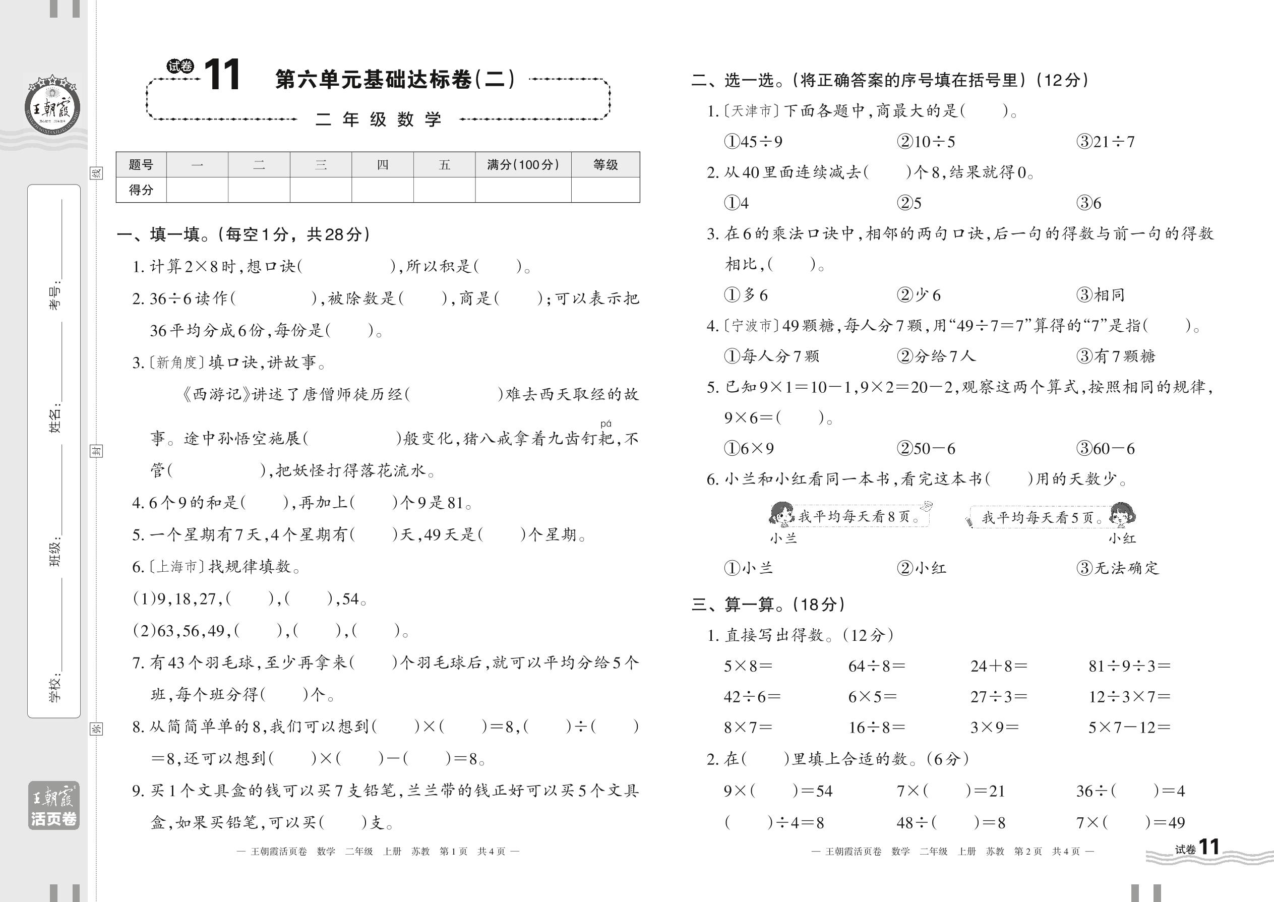 2023上册二年级数学苏教版 试卷11 第六单元基础达标卷(二)