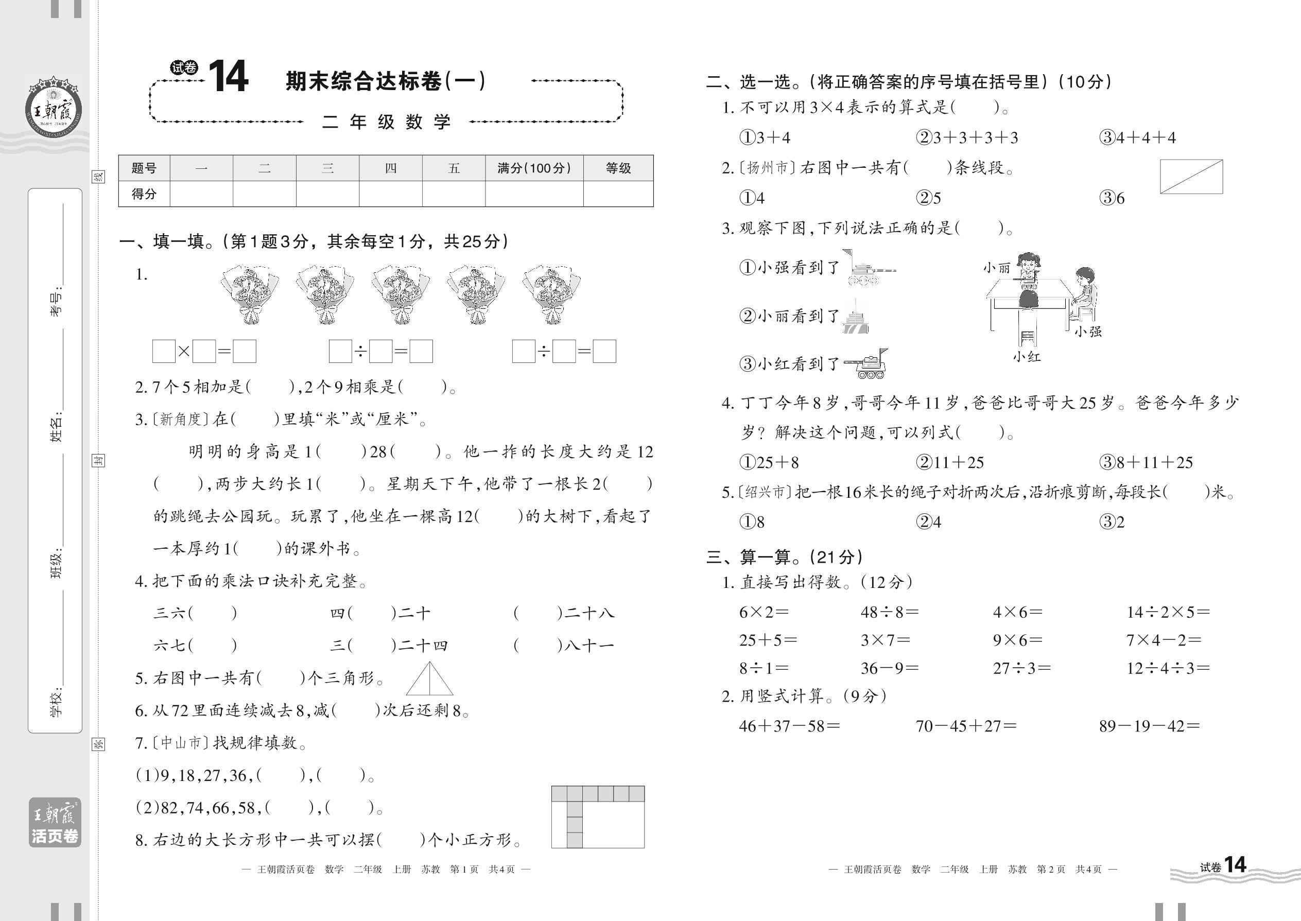2023上册二年级数学苏教版 试卷14 期末综合达标卷(一)