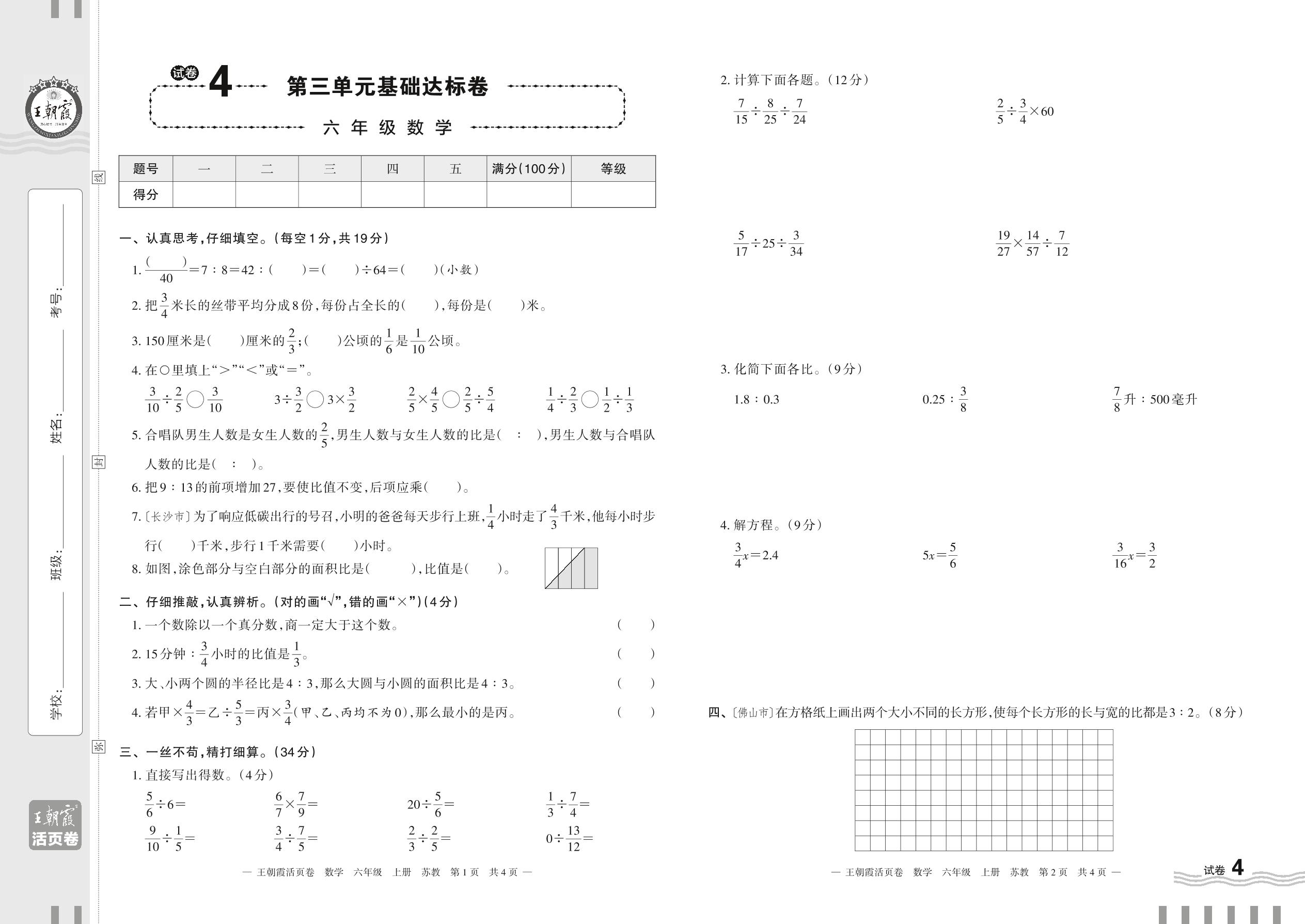2023上册六年级数学苏教版 试卷4 第三单元基础达标卷